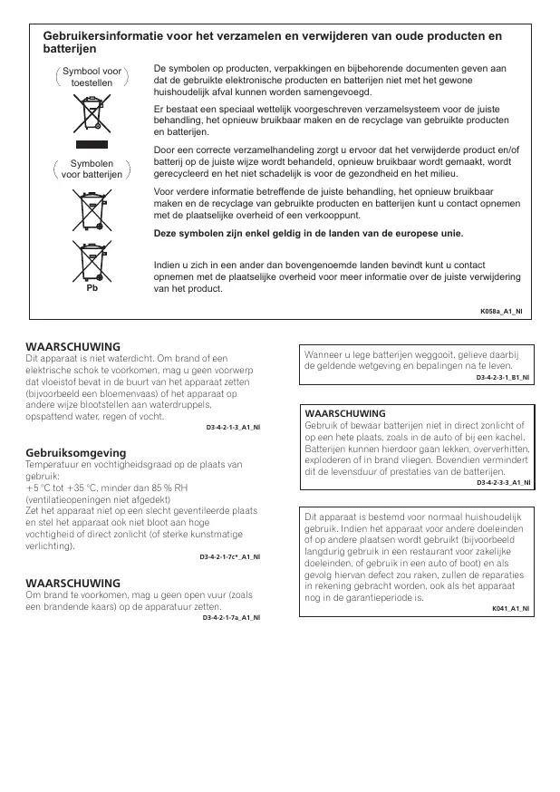 Fe van het product WAARSCHUWING Di apparaat is niet waterdicht Om brancl af sen anneer u leg batterien eggoo, eleve daarbl eiektrische schok te voothomen, mag u geen voorwe de geldende wetgeving en bepalngen na te leven. dat voeistot besat in de buurt van het apparaat zetten mate (bisgotbeeld een bloemensaas) of et apparaat ap andere wize bloctstllen aan watercruppels, opspatien water, regen of soc WAARSCHUWING