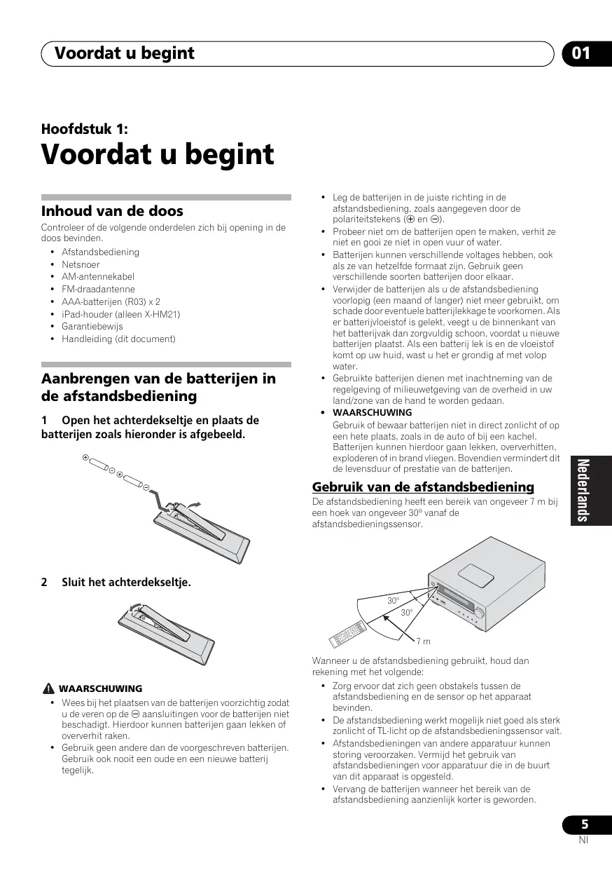 Indien u zich in een ander dan bovengenoemde landen bevindt kunt u contact opnemen met de plaatseli ke overheid voor meer informatie over de uiste verwi dering van het product. K058a_A1_Nl Hartelijk dank voor de aanschaf van dit Pioneer produkt. Lees deze handleiding zorgvuldig door zodat u weet hoe u uw apparaat moet gebruiken. Bewaar de handleiding op een veilige plaats voor eventuele naslag in de toekomst. Inhoudsopgave 01 Voordat u begint Inhoud van de doos . . . . . . . . . . . . . . . . . . . . . . . . . . . . . 5 Aanbrengen van de batterijen in de afstandsbediening . . . . . . . . . . . . . . . . . . . . . . . . . . . . . . 5 Gebruik van de afstandsbediening. . . . . . . . . . . . . . . . . . 5 02 Overzicht van de bedieningstoetsen Afstandsbediening . . . . . . . . . . . . . . . . . . . . . . . . . . . . . Luidsprekersysteem . . . . . . . . . . . . . . . . . . . . . . . . . . . . Voorpaneel . . . . . . . . . . . . . . . . . . . . . . . . . . . . . . . . . . . . Display . . . . . . . . . . . . . . . . . . . . . . . . . . . . . . . . . . . . . . .