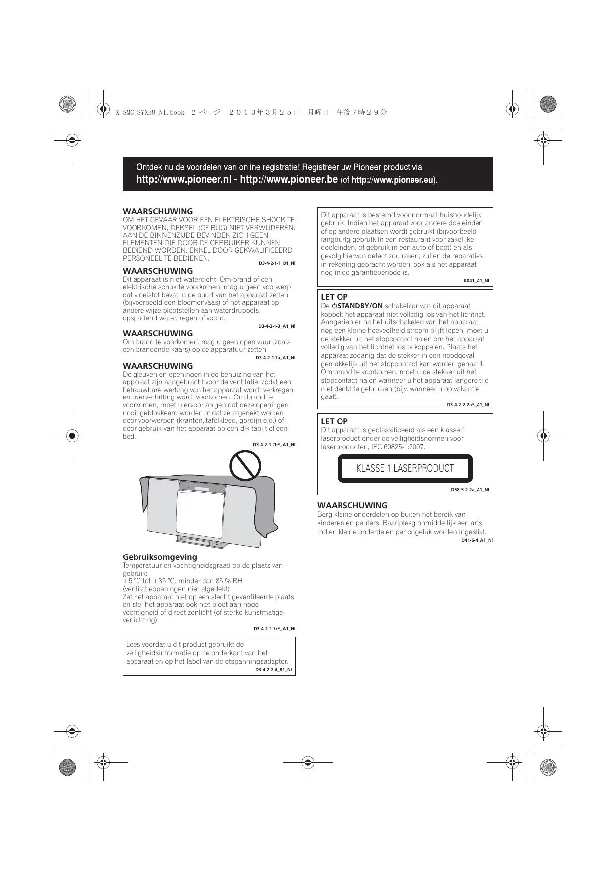 ( Symbolen ) voor batterijen Door een correcte verzamelhandeling zorgt u ervoor dat het verwijderde product en/of batterij op de juiste wijze wordt behandeld, opnieuw bruikbaar wordt gemaakt, wordt gerecycleerd en het niet schadelik is voor de gezondheid en het milieu. Voor verdere informatie betreffende de juiste behandiing, het opnieuw bruikbaar maken en de recyclage van gebruikte producten en batterijen kunt u contact opnemen met de plaatselike overheid of een verkooppunt. Deze symbolen zijn enkel geldig in de landen van de europese unie. Indien u zich in een ander dan bovengenoemde landen bevindt kunt u contact opnemen met de plaatselijke overheid voor meer informatie over de juiste verwijdering Pb van het product. KOSta ANT Waarschuwing bij de Waarschuwing radiogolven wisselstroomadapter Dit tosstel maakt gebruik van radiogolven met een + Haud de wisselstroomaclapter bij het frequentie van 2 4 GHz, een band die ook gebruikt wordt hoofdgedeelte vast wanneër u dure van de door andere draadloze systemen (draadloze telefoons, netstroom verwijdert. Het netsnoer raakt mogelijk magnetronovens enz) S beschadigd als u eraan trek, en dit kan tevens In dit geval verschint er ruis in het televisiebeeld en is het N leiden tot brand en/of elektrocutie. mogelijk dat dit apparaat (en ook de producten die door die + De wisselstroomadapter moet niet met natte apparaat worden ondersteund) signaalinterferentie handen worden ingestaken of verwijderd, omdat Yercorzaaht in de antenneingangsaansuiting van uv Ait Lan leider lot eleroeu te televisie, video-apparaat satellittuner en. + Steck de tanden van de wisselstroomadapter Vergroot in een dergelik geval de afstand tussen de geheel in het stopcontact. Als de tanden niet ingangsaansluiting voar de antenne en dit toestel (inclusief volledig zijn ingestoken, kan hittevorming door dit toestel ondersteunde apparatuun. ontstaan, wat kan leiden tot brand. Daarbij kan + Pioneer kan niet aansprakelijk worden gesteld voor cantact met de aangesloten tanden van de storingen of foutieve werking van het geschikte Pioneer adapter leiden tot elektrocutie. product door communicatiefouten/staringen die + Steck de wisselstroomadapter niet in sen Samenhangen met uw netwerkwerbinding en/of de contactdoos waarvan de aansluiting los zit, ook al aangesloten apparatuur. Raadpleeg uw Internet-provider zijn de tanden geheel in het stopcontact of de fabrikant van uw netwerkapparatuur. ingestoken. Hitte kan zich ophopen en dit kan + Eris een aparte overeenkomst/betaling vereist met/aan leiden tot brand. Raadpleeg het verkooppunt of een internet service provider om gebruik te kunnen een elektricien in verband met vervanging van het maken van het intemet stopcontact. WAARSCHUWING NETSNOER + Het apparaat noch meubilair en dergelijke mag op Pak het netsnoer beet bij de stekker. Trek de stekker er het netsnoer worden geplaatst of het snoer niet uit door aan het snoër te trekken en trek nooît aan afknellen. Leg geen knoop in het snoer en knoop het netsnoer met natte handen aangezien dit het niet vast aan andere snoeren. De netsnoeren kortsluiting of een elektrische schok tot gevolg kan moeten zodanig worden geleid dat er niet heben. Plaats geen toestel, meubelstuk o..d. op het gemakkelik op getrapt kan worden. Een netsnoer, en klem het niet vast, Maak er naoït een knoop beschadigde wisselstroomadapter en netsnoer in en en verbind het evenmin met andere snoeren, De kunnen leiden tot brand of een elektrische schok netsnoeren dienen 20 te worden geleid dat er niet per veroorzaken. Controleer nu en dan de ongeluk iemand op gaat staan, Een beschadigd wisselstroomadapter en het netsnoer. AIS het netsnoer kan brand of een elektrische schok beschadigd zijn kunt u ze door het dichtstbijzinde veroorzaken. Kontroleer het netsnoer af en toe. Wanneer PIONEER-onderhoudscentrum of uw verkooppunt ü de indruk krigt dat het beschadigd is, dient u bij uw laten vervangen. dichtstbijzinnde erkende PIONEER onderhoudscentrum of uw dealer een nieuw snoer te kopen. soc2e at ni