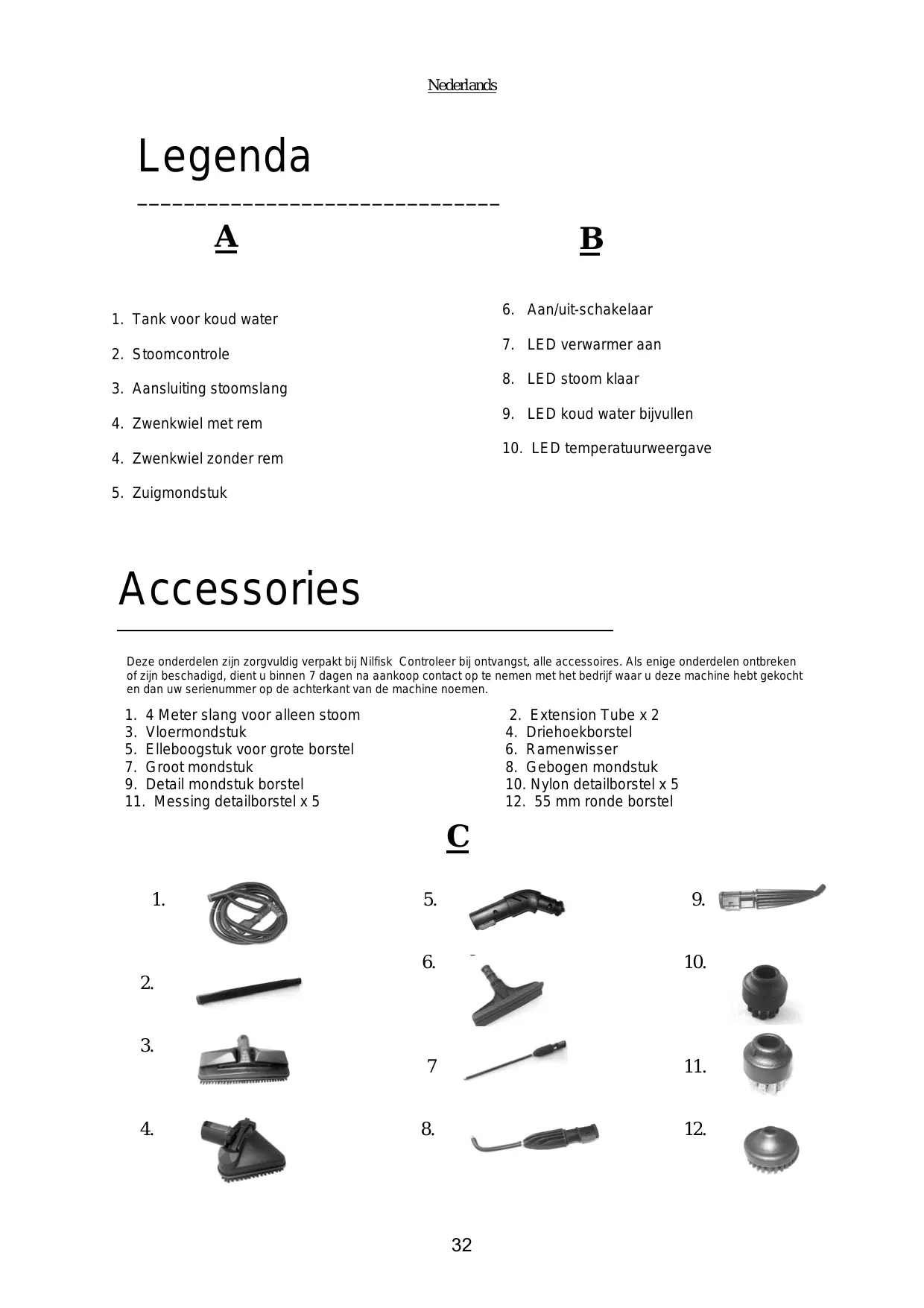 4. Mettre le commutateur On/Off (Marche/Arrêt) (Numéro 7 schéma B) sur la position ON. Le voyant LED réchauffeur (Numéro 8 Schéma B) s'allumera. 5. Attendre environ 5 minutes pour que la chaudière chauffe l'eau 6. Lorsque le voyant LED vapeur prête (Numéro 9 Schéma B) s'allume, la machine est prête à être utilisée. 7. Les commandes de poignées sont maintenant actives. • Le commutateur ventilateur sur la poignée du flexible injectera de la vapeur lorsqu'on appuie dessus • En appuyant sur le commutateur "détergent" en haut de • la poignée, on mettra en route la pompe de détergent. Appuyer sur ce commutateur aussi longtemps que vous voulez injecter du détergent. En relâchant le commutateur, vous arrêterez l'injection de détergent. 8. Le débit de vapeur peut être réglé à l'aide du bouton "régulation de vapeur" (Numéro 2 Schéma A) 9. Choisir et installer l'accessoire voulu (Schéma C) sur la poignée du flexible. !! En cours d'utilisation, ne pas oublier qu'ils seront très chauds.