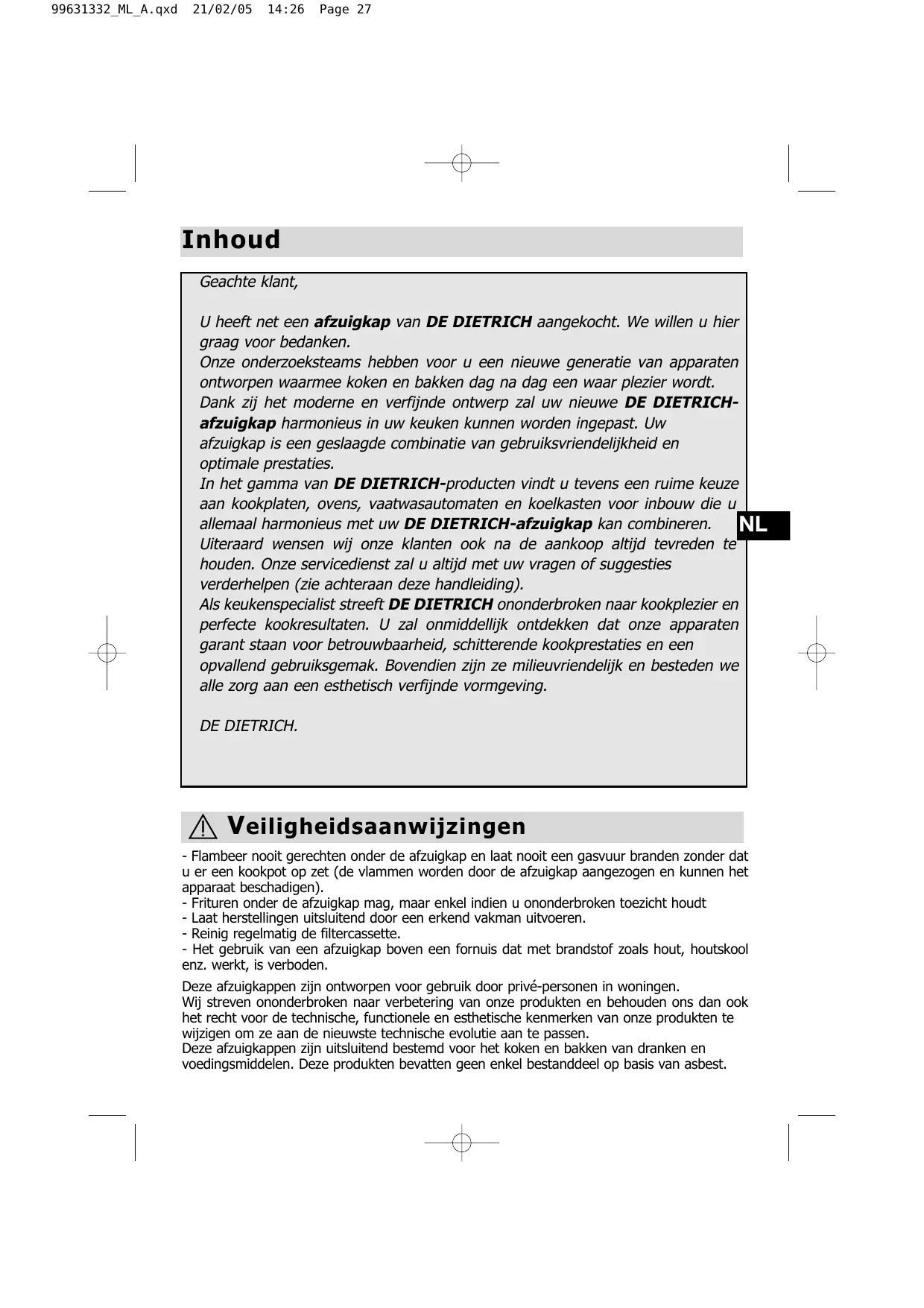 Deze afzugkappen zijnuitsluitendbestemd voor het koken en bakken van dranken en voedingsmiddelen. Dezeprodukten bevatten geen enkel bestanddeel op basis van asbest.