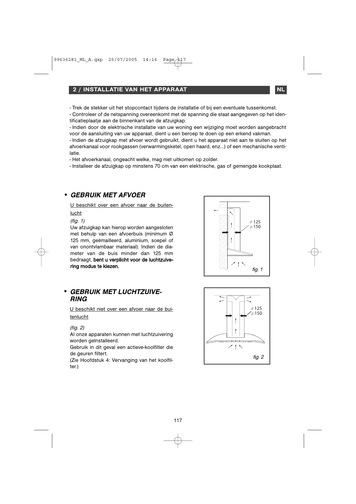 Indien uw keuken worden verwarmd met een toestel dat op een schouw is aangeslo ten (kachel...), dient u de afzuigkap met luchtzuivering te installeren. Gebruik de afzuigkap nooit zonder de filtercassettes. Gebruikt u in een bepalde ruimte geleijktijd eig een afzuigkap en apparaten die op gas of een andere brandstof werken, zorg dan voor voldoende ventilatie in de ruimte.