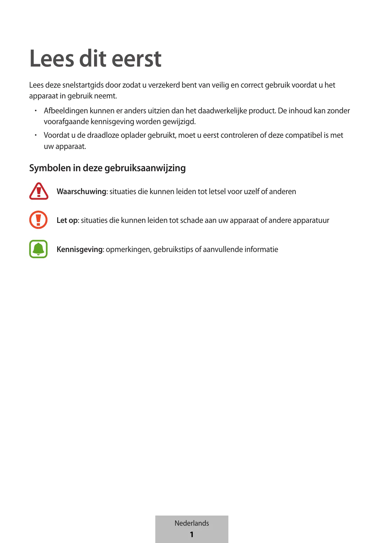 - Voordat u de draadloze oplader gebruikt, moet u eerst controleren of deze compatibel is met uw apparaat. Symbolen in deze gebruiksaanwijzing Waarschuwing: situaties die kunnen leiden tot letsel voor uzelf of anderen Let op: situaties die kunnen leiden tot schade aan uw apparaat of andere apparatuur Kennisgeving: opmerkingen, gebruikstips of aanvullende informatie Nederlands