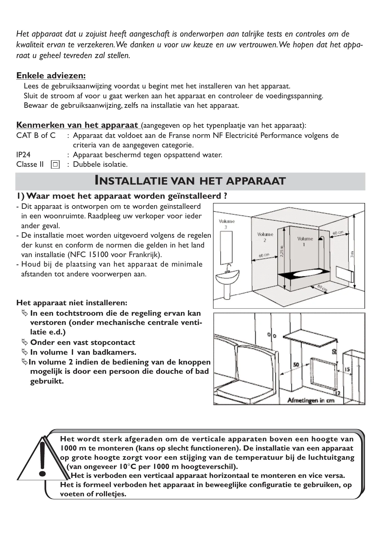 CAT B ou C : Appareil satisfaisant à la norme NF Electricité Performance selon les critères de la catégorie indiquée. IP24 : Appareil protégé contre les projections d’eau. Classe II - L’installation doit être faite dans les règles de l’art et conforme aux normes en vigueur dans le pays d’installation (NFC 15100 pour la France). - Respecter les distances minimales avec les obstacles pour l’emplacement de l’appareil.