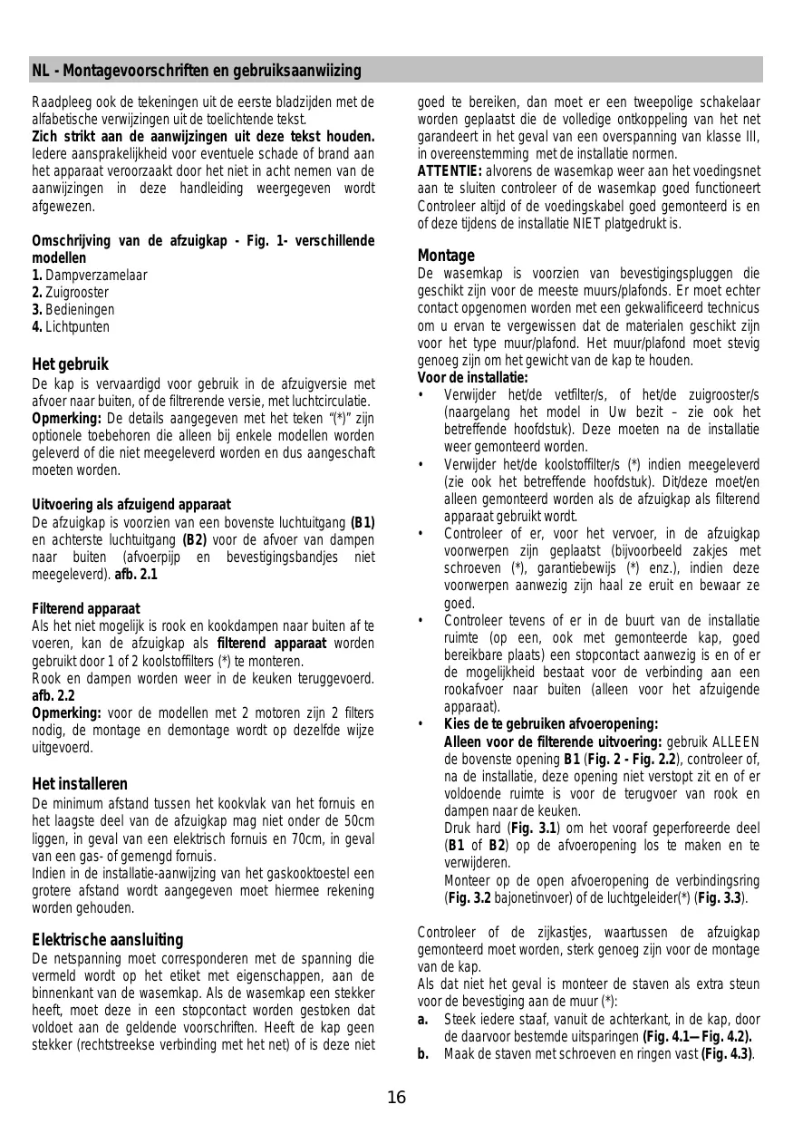 - Kies de te gebruiken afvoeropening: Alleen voor de filterende uitvoering: gebruik ALLEEN de bovenste opening B1 (Fig. 2 - Fig. 2.2), controleer of, na de installatie, deze opening niet verstopt zit en of er voldoende ruimte is voor de terugvoer van rook en dampen naar de keuken. Druk hard (Fig. 3.1) om het vooraf geperforeerde deel (B1 of B2) op de afvoeropening los te maken en te verwijderen. Monteer op de open afvoeropening de verbindingsring (Fig. 3.2 bajonetinvoer) of de luchtgeleider(*) (Fig. 3.3). Het gebruik De kap is vervaardigd voor gebruik in de afzuigversie met afvoer naar buiten, of de filtrerende versie, met luchtcirculatie. Opmerking: De details aangegeven met het teken “(*)” zijn optionele toebehoren die alleen bij enkele modellen worden geleverd of die niet meegeleverd worden en dus aangeschaft moeten worden. Uitvoering als afzuigend apparaat De afzuigkap is voorzien van een bovenste luchtuitgang (B1) en achterste luchtuitgang (B2) voor de afvoer van dampen naar buiten (afvoerpijp en bevestigingsbandjes niet meegeleverd). afb. 2.1 Filterend apparaat Als het niet mogelijk is rook en kookdampen naar buiten af te voeren, kan de afzuigkap als filterend apparaat worden gebruikt door 1 of 2 koolstoffilters (*) te monteren. Rook en dampen worden weer in de keuken teruggevoerd. afb. 2.2 Opmerking: voor de modellen met 2 motoren zijn 2 filters nodig, de montage en demontage wordt op dezelfde wijze uitgevoerd. Het installeren De minimum afstand tussen het kookvlak van het fornuis en het laagste deel van de afzuigkap mag niet onder de 50cm liggen, in geval van een elektrisch fornuis en 70cm, in geval van een gas- of gemengd fornuis. Indien in de installatie-aanwijzing van het gaskooktoestel een grotere afstand wordt aangegeven moet hiermee rekening worden gehouden. Controleer of de zijkastjes, waartussen de afzuigkap gemonteerd moet worden, sterk genoeg zijn voor de montage van de kap. Als dat niet het geval is monteer de staven als extra steun voor de bevestiging aan de muur (*): a. Steek iedere staaf, vanuit de achterkant, in de kap, door de daarvoor bestemde uitsparingen (Fig. 4.1—Fig. 4.2). b. Maak de staven met schroeven en ringen vast (Fig. 4.3). Elektrische aansluiting De netspanning moet corresponderen met de spanning die vermeld wordt op het etiket met eigenschappen, aan de binnenkant van de wasemkap. Als de wasemkap een stekker heeft, moet deze in een stopcontact worden gestoken dat voldoet aan de geldende voorschriften. Heeft de kap geen stekker (rechtstreekse verbinding met het net) of is deze niet