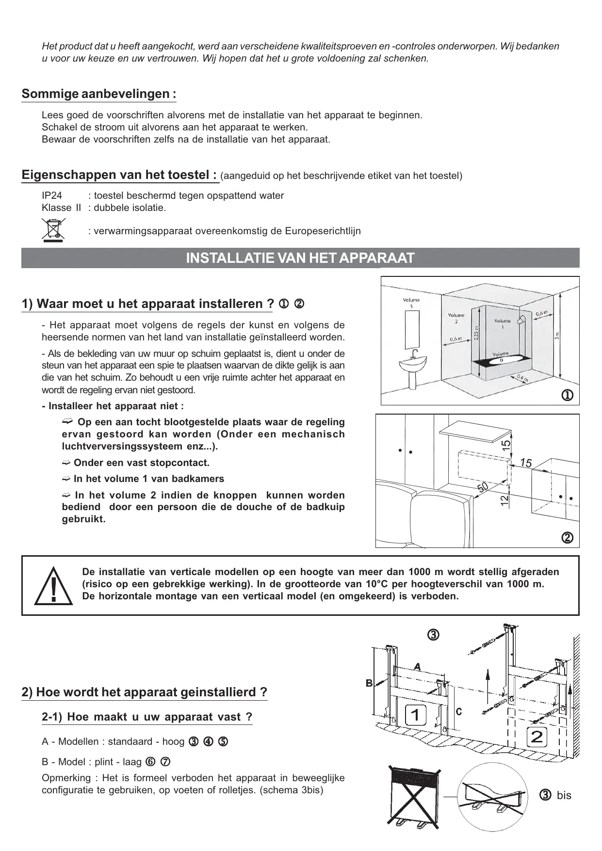 Opmerking : Het isformeel verboden het apparaat in beweeglijke configuratie te gebruiken, op voeten of rolletjes. (schema 3bis)