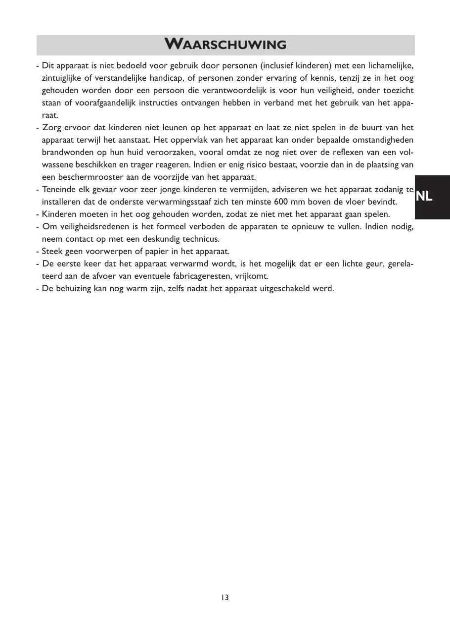 - Pour éviter tout danger pour les très jeunes enfants, il est recommandé d’installer cet appareil de façon telle que le barreau chauffant le plus bas soit au moins 600 mm au-dessus du sol. - Il convient de surveiller les enfants afin qu’ils ne jouent pas avec l’appareil. - Pour des raisons de sécurité, il est formellement interdit de re-remplir les appareils. En cas de besoin, contactez un professionnel qualifié. - Toutes interventions sur les parties électriques doivent être effectuées par un professionnel qualifié. - Veillez à ne pas introduire d’objets ou du papier dans l’appareil. - A la première mise en chauffe, une légère odeur peut apparaître correspondant à l’évacuation des éventuelles traces liées à la fabrication de l’appareil. - Le boîtier peut être chaud, même à l’arrêt.
