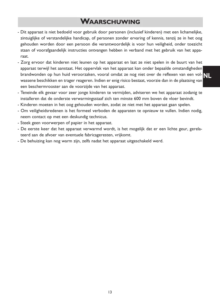 - Pour éviter tout danger pour les très jeunes enfants, il est recommandé d’installer cet appareil de façon telle que le barreau chauffant le plus bas soit au moins 600 mm au-dessus du sol. - Il convient de surveiller les enfants afin qu’ils ne jouent pas avec l’appareil. - Pour des raisons de sécurité, il est formellement interdit de re-remplir les appareils. En cas de besoin, contactez un professionnel qualifié. - Toutes interventions sur les parties électriques doivent être effectuées par un professionnel qualifié. - Veillez à ne pas introduire d’objets ou du papier dans l’appareil. - A la première mise en chauffe, une légère odeur peut apparaître correspondant à l’évacuation des éventuelles traces liées à la fabrication de l’appareil. - Le boîtier peut être chaud, même à l’arrêt.