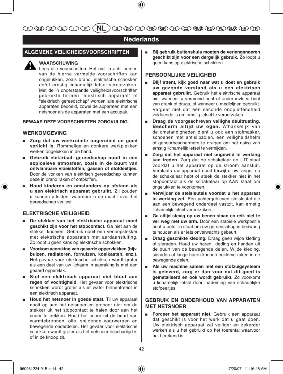 Neem deze verilgheidsvoorschriften in acht als u het apparaat, de accessoires, de hulpstukken, enz. gebruikt en houd waar bij rekening met de bijzondere eigenschappen van uw apparaat, de plek waar u werkt en het soort werk dat u doet. Gebruik uw elektrisch apparaatuitsuiultend voor de toepassingen waarvoord het bestemd is om gaavoarlijke situatuies te vermijden.