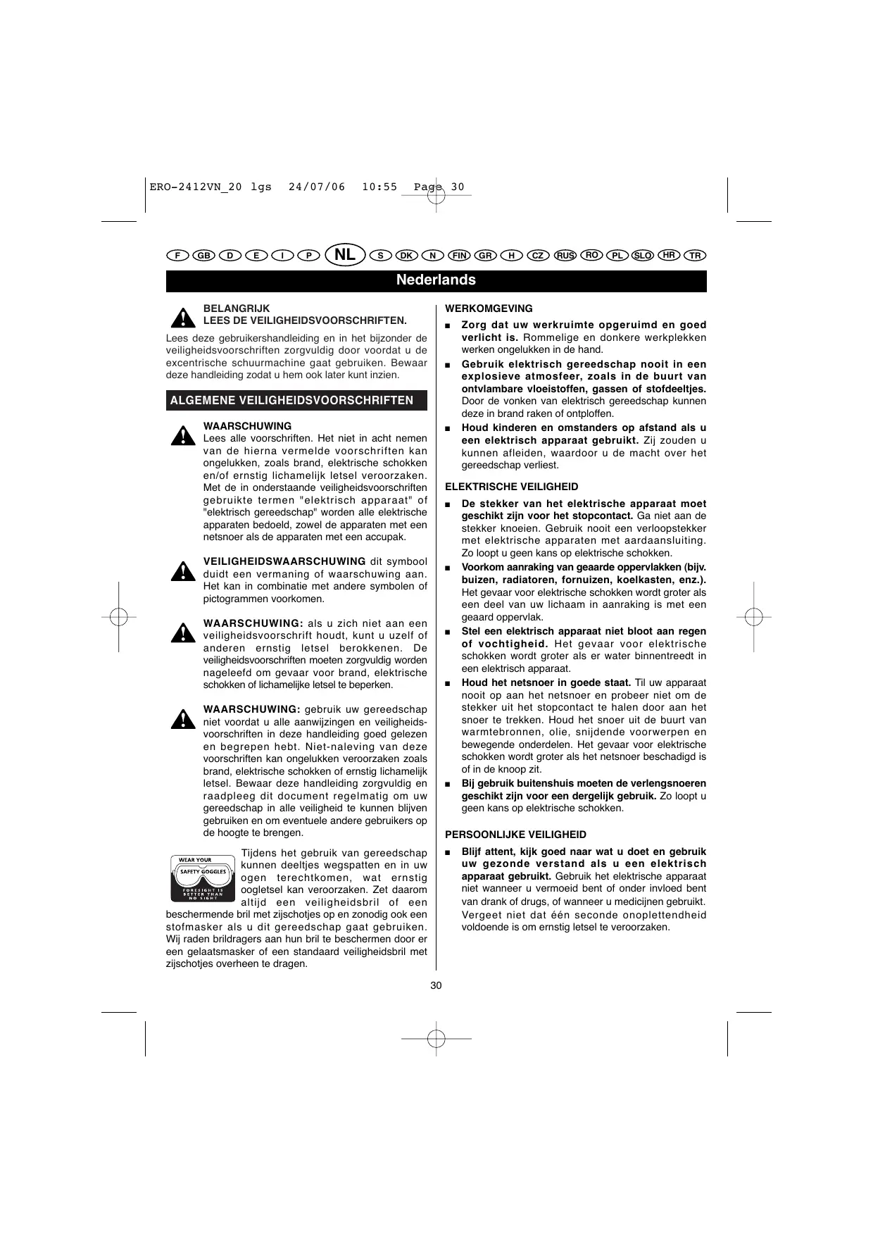 Blijf attent, kijk goed naar wat u doet en gebruik uw gezonde verstand als u een elektrisch apparaat gebruikt. Gebruik het elektrische apparaat niet wanneer u vermoeid bent of onder invloed bent van drank of drugs, of wanneer u medicijnen gebruikt. Vergeet niet dat één seconde onoplettendheid voldoende is om ernstig letsel te veroorzaken. ERO-2412VN_20 lgs