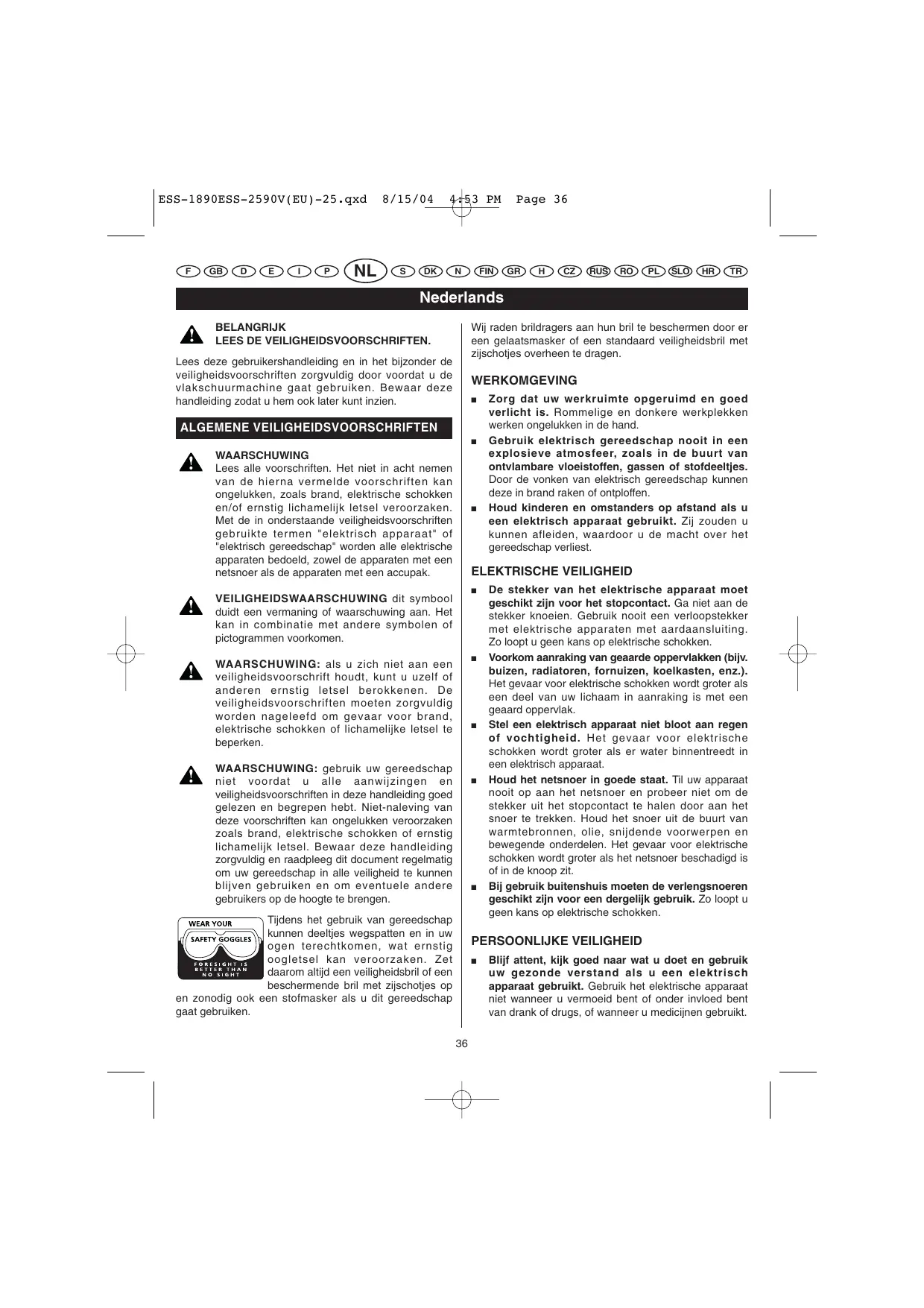 Blijf attent, kijk goed naar wat u doet en gebruik uw gezonde verstand als u een elektrisch apparaat gebruikt. Gebruik het elektrische apparaat niet wanneer u vermoeid bent of onder invloed bent van drank of drugs, of wanneer u medicijnen gebruikt. ESS-1890ESS-2590V(EU)-25.qxd