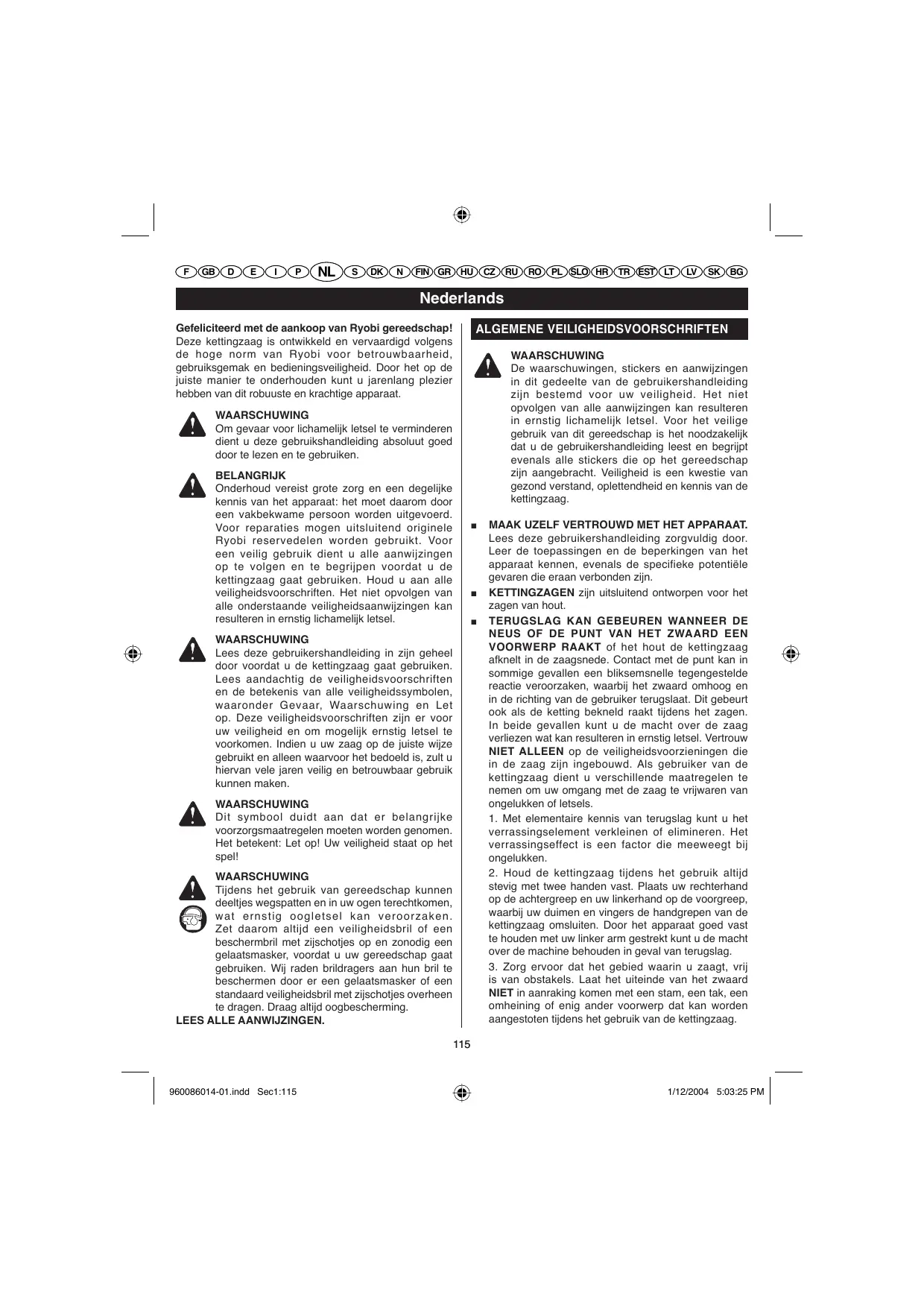Nederlands Gefeliciteerd met de aankoop van Ryobi gereedschap! Deze kettingzaag is ontwikkeld en vervaardigd volgens de hoge norm van Ryobi voor betrouwbaarheid, gebruiksgemak en bedieningsveiligheid. Door het op de juiste manier te onderhouden kunt u jarenlang plezier hebben van dit robuuste en krachtige apparaat. ALGEMENE VEILIGHEIDSVOORSCHRIFTEN WAARSCHUWING De waarschuwingen, stickers en aanwijzingen in dit gedeelte van de gebruikershandleiding zijn bestemd voor uw veiligheid. Het niet opvolgen van alle aanwijzingen kan resulteren in ernstig lichamelijk letsel. Voor het veilige gebruik van dit gereedschap is het noodzakelijk dat u de gebruikershandleiding leest en begrijpt evenals alle stickers die op het gereedschap zijn aangebracht. Veiligheid is een kwestie van gezond verstand, oplettendheid en kennis van de kettingzaag. WAARSCHUWING Om gevaar voor lichamelijk letsel te verminderen dient u deze gebruikshandleiding absoluut goed door te lezen en te gebruiken. BELANGRIJK Onderhoud vereist grote zorg en een degelijke kennis van het apparaat: het moet daarom door een vakbekwame persoon worden uitgevoerd. Voor reparaties mogen uitsluitend originele Ryobi reservedelen worden gebruikt. Voor een veilig gebruik dient u alle aanwijzingen op te volgen en te begrijpen voordat u de kettingzaag gaat gebruiken. Houd u aan alle veiligheidsvoorschriften. Het niet opvolgen van alle onderstaande veiligheidsaanwijzingen kan resulteren in ernstig lichamelijk letsel.
