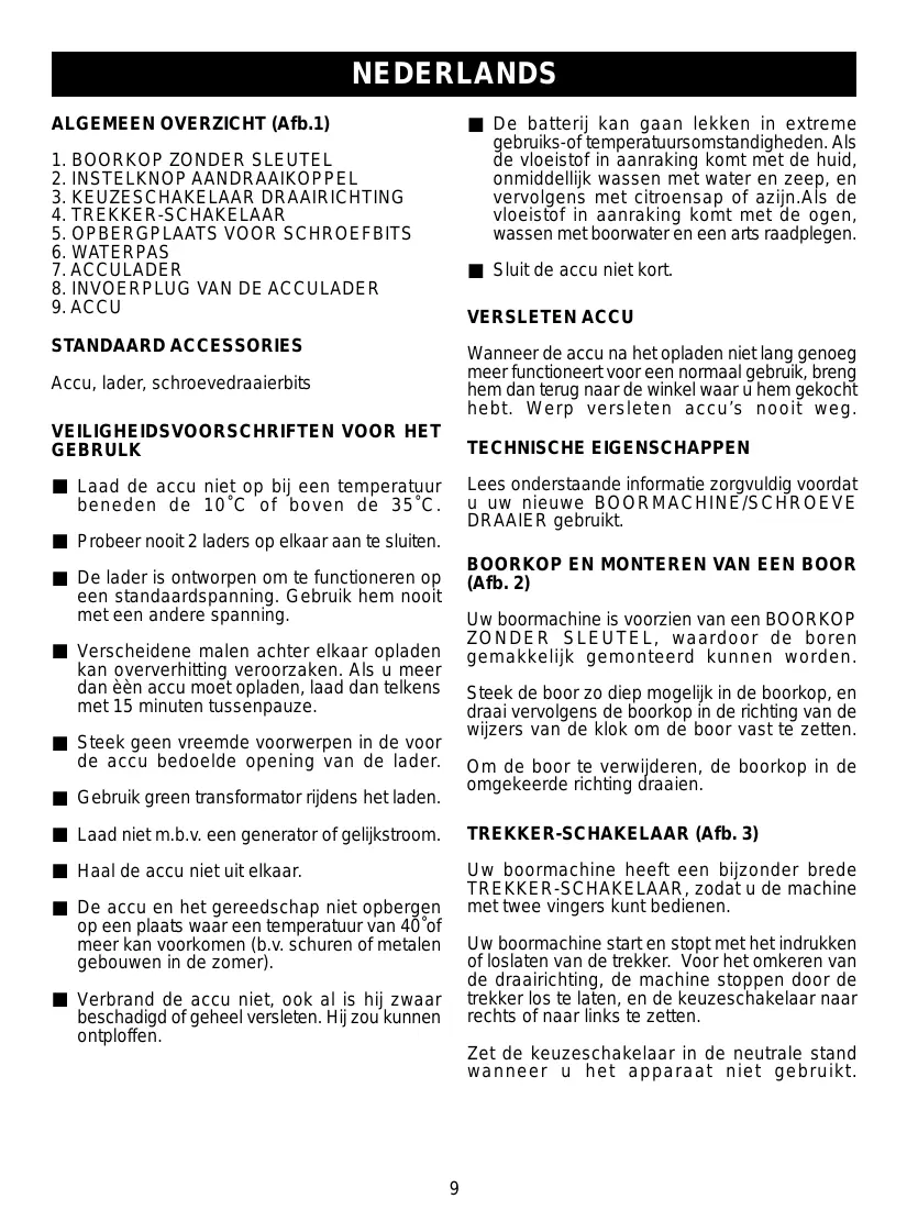(Afb. 2) ■ De lader is ontworpen om te functioneren op een standaardspanning. Gebruik hem nooit met een andere spanning. Uw boormachine is voorzien van een BOORKOP ZONDER SLEUTEL, waardoor de boren gemakkelijk gemonteerd kunnen worden. ■ Verscheidene malen achter elkaar opladen kan oververhitting veroorzaken. Als u meer dan èèn accu moet opladen, laad dan telkens met 15 minuten tussenpauze. Steek de boor zo diep mogelijk in de boorkop, en draai vervolgens de boorkop in de richting van de wijzers van de klok om de boor vast te zetten. ■ Steek geen vreemde voorwerpen in de voor de accu bedoelde opening van de lader. Om de boor te verwijderen, de boorkop in de omgekeerde richting draaien. ■ Gebruik green transformator rijdens het laden. ■ Laad niet m.b.v. een generator of gelijkstroom. TREKKER-SCHAKELAAR (Afb. 3) ■ Haal de accu niet uit elkaar. Uw boormachine heeft een bijzonder brede TREKKER-SCHAKELAAR, zodat u de machine met twee vingers kunt bedienen. ■ De accu en het gereedschap niet opbergen op een plaats waar een temperatuur van 40˚of meer kan voorkomen (b.v. schuren of metalen gebouwen in de zomer). Uw boormachine start en stopt met het indrukken of loslaten van de trekker. Voor het omkeren van de draairichting, de machine stoppen door de trekker los te laten, en de keuzeschakelaar naar rechts of naar links te zetten. ■ Verbrand de accu niet, ook al is hij zwaar beschadigd of geheel versleten. Hij zou kunnen ontploffen. Zet de keuzeschakelaar in de neutrale stand wanneer u het apparaat niet gebruikt.