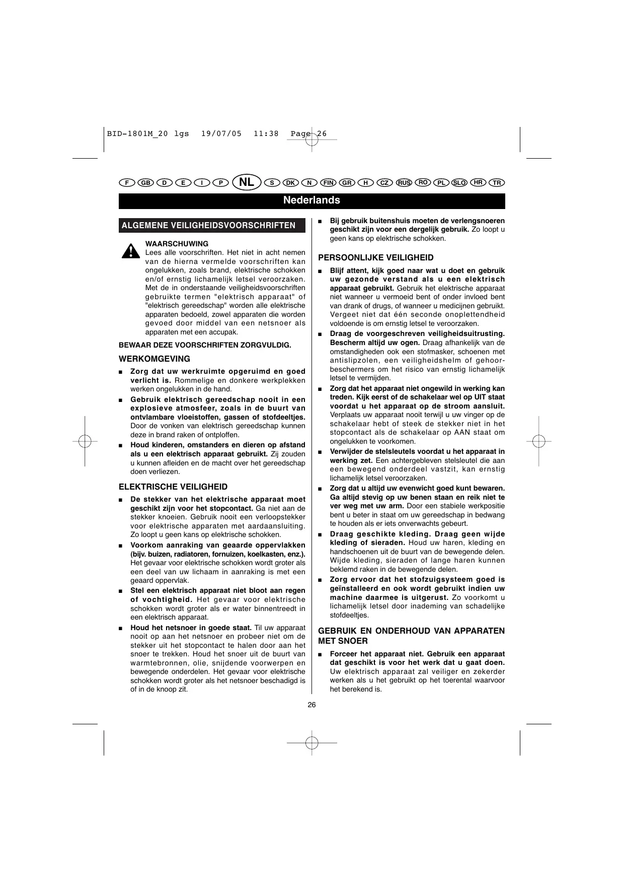 Controleer of de netspanning overeenkomt met de aanduidingen op het typeplaatje van het apparaat. Gebruik uw apparaat nooit zonder de behuizing of als er bouten ontbreken. Als de behuizing of bouten zijn weggenomen, breng deze dan weer terug aan voordat u het apparaat gaat gebruiken. Houd alle onderdelen in goede staat van werking. Zorg dat u stevig greep hebt op het apparaat wanneer u hoog werkt. Raak tijdens gebruik nooit het schroefbit, het zaagblad, de slijpschijf of andere bewegende delen aan. Start de machine nooit wanneer het draaiend deel in aanraking is met het werkstuk. Leg nooit een apparaat neer voordat alle bewegende delen volledig tot stilstand zijn gekomen. ACCESSOIRES: Het gebruik van andere accessoires en hulpstukken dan die welke in deze handleiding worden aanbevolen kan gevaar opleveren. RESERVEONDERDELEN: Gebruik bij vervanging uitsluitend originele reserveonderdelen. BID-1801M_20 lgs