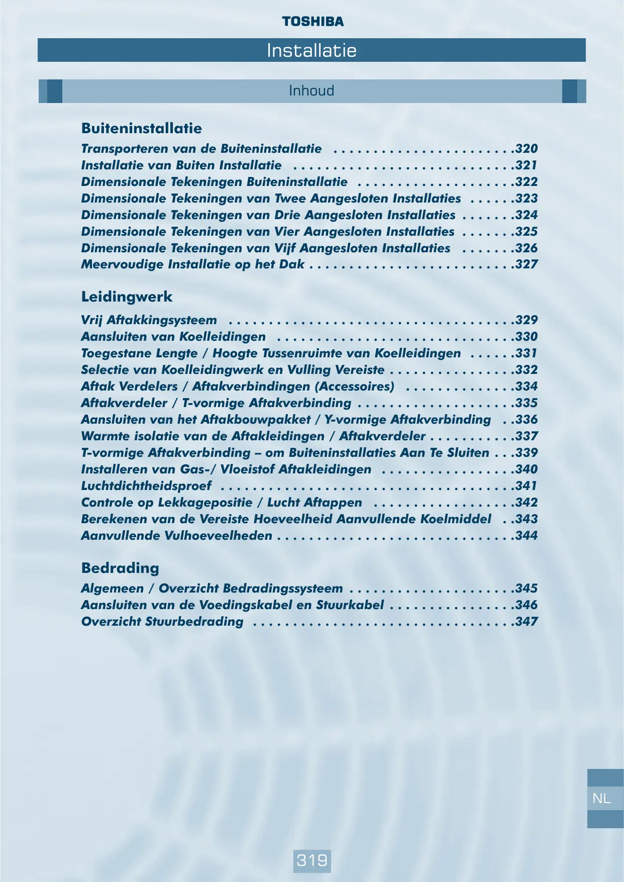 Inhoud Buiteninstallatie Transporteren van de Buiteninstallatie 320 Installatie van Buiten Installatie 321 Dimensionale Tekeningen Buiteninstallatie 322 Dimensionale Tekeningen van Twee Aangesloten Installaties 323