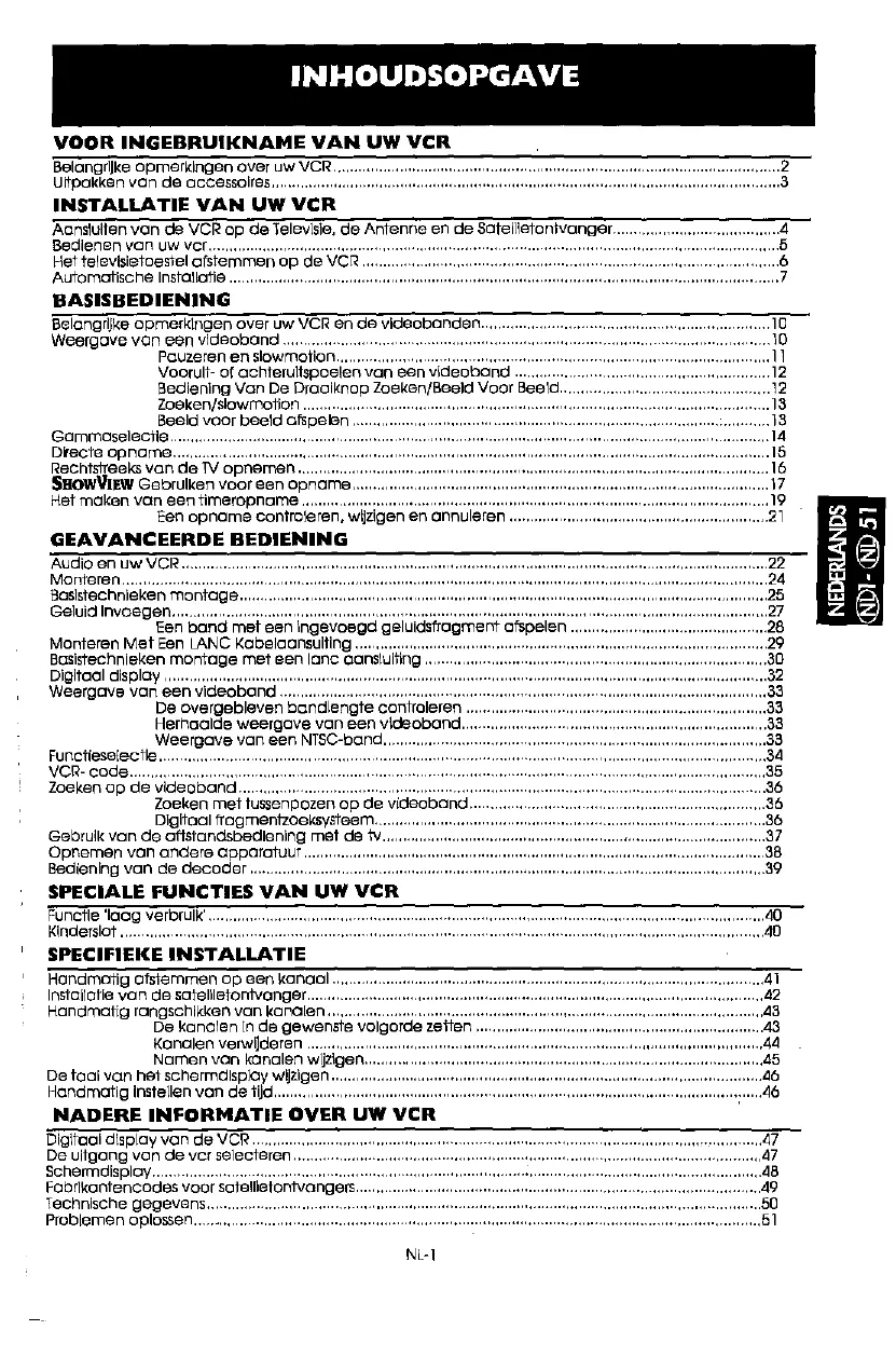 Deze VCR heeft geen netschakelaar, Daarom krijgt de klak artijd nominale stroam wanneerhet wisselstraamsnoer in een stopcontact is gestoken. Haaf de stekker uit het stopcontact wanneer u de VCR voor rangere tijd niet lurt gebrulken, NL-2