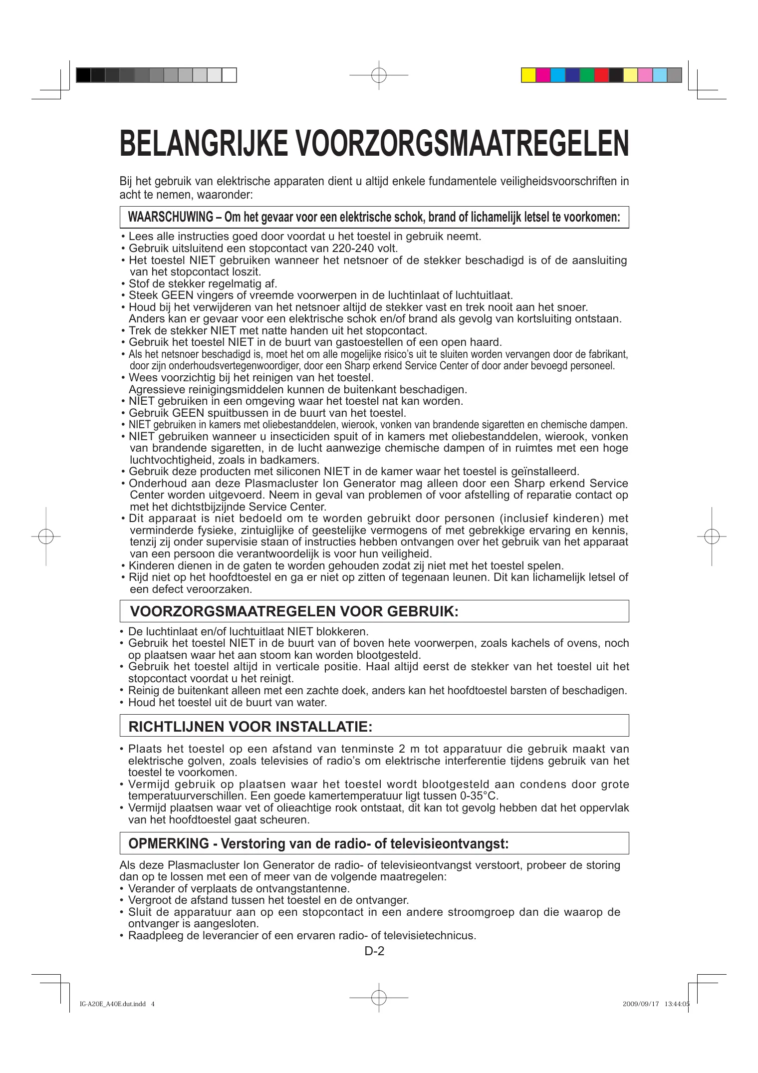 - Bij 24-uurs gebruik is vervanging iedere 2 jaar (17.500 uur) vereist. Wanneer de Plasmacluster Ion Generating Unit niet wordt vervangen, stopt de werking van de IG-A20E en IG-A40E na ongeveer 26 maanden (19.000 uur). Bedankt voor het aankopen van de SHARP Plasmacluster Ion Generator. Lees deze handleiding aandachtig door voordat u de Plasmacluster Ion Generator gebruikt. Bewaar de handleiding na het lezen op een goed bereikbare plaats om deze later opnieuw te kunnen raadplegen. D-1 IG-A20E̲A40E.dut.indd 3 2009/09/17 13:44:05 BELANGRIJKE VOORZORGSMAATREGELEN Bij het gebruik van elektrische apparaten dient u altijd enkele fundamentele veiligheidsvoorschriften in acht te nemen, waaronder: WAARSCHUWING – Om het gevaar voor een elektrische schok, brand of lichamelijk letsel te voorkomen: