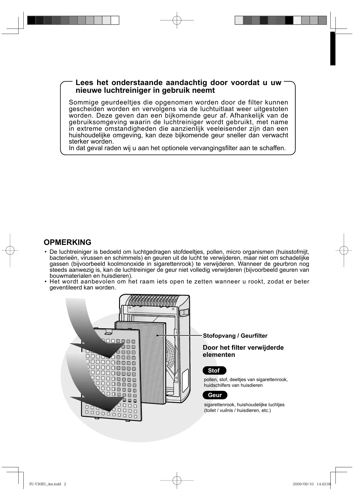 Dank u voor het aanschaffen van de SHARP luchtreiniger. Lees deze gebruiksaanwijzing in zijn geheel aandachtig door voor de juiste gebruiksinformatie. Zorg ervoor dat u het hoofdstuk “Belangrijke veiligheidsvoorschriften” goed gelezen heeft voordat u dit product in gebruik neemt. Bewaar de gebruiksaanwijzing na het lezen op een goed bereikbare plaats om hem later opnieuw te kunnen raadplegen.