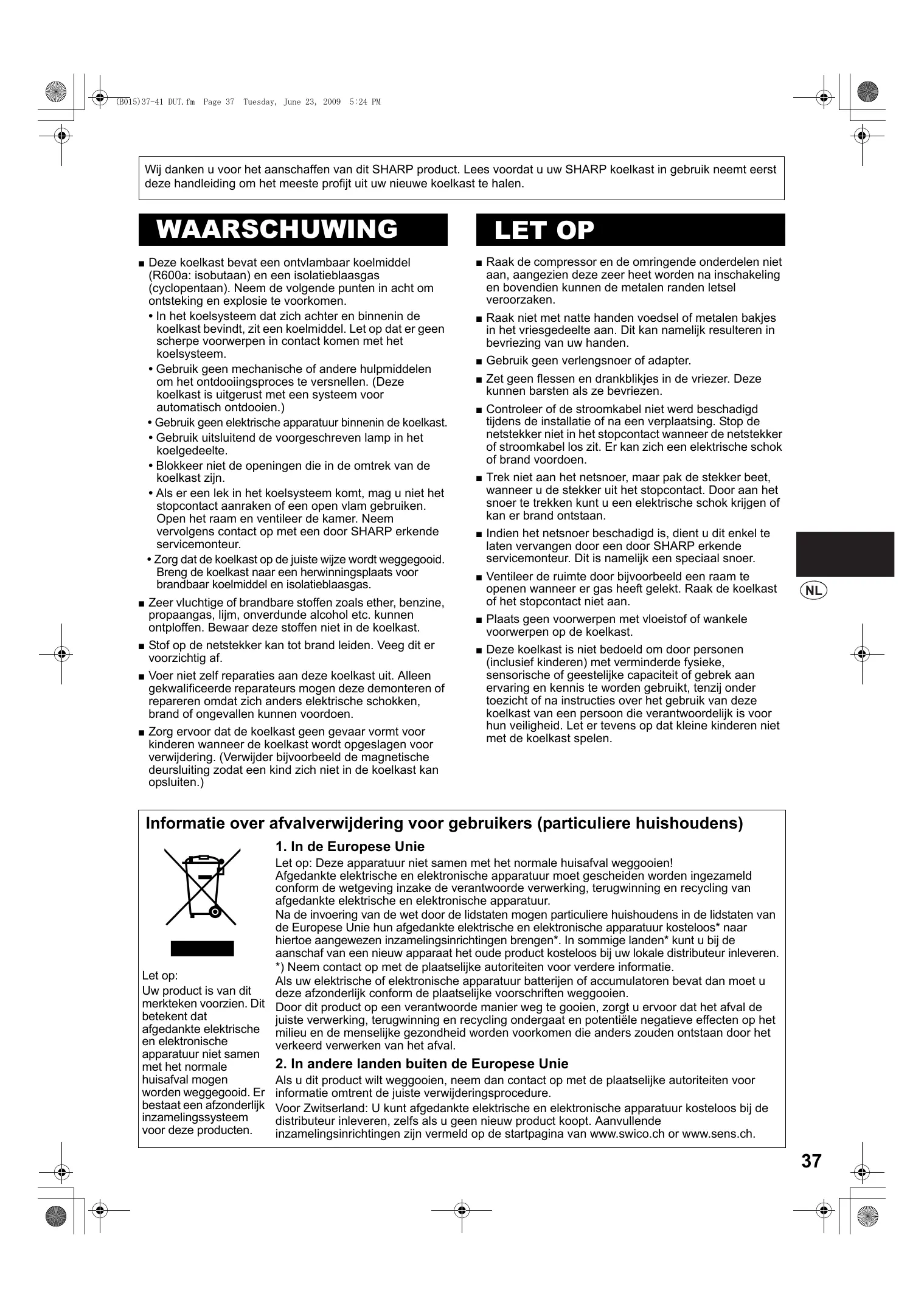 (B015)37-41 DUT.fm Page 37 Tuesday, June 23, 2009 5:24 PM Wij danken u voor het aanschaffen van dit SHARP product. Lees voordat u uw SHARP koelkast in gebruik neemt eerst deze handleiding om het meeste profijt uit uw nieuwe koelkast te halen. WAARSCHUWING Deze koelkast bevat een ontvlambaar koelmiddel (R600a: isobutaan) en een isolatieblaasgas (cyclopentaan). Neem de volgende punten in acht om ontsteking en explosie te voorkomen.