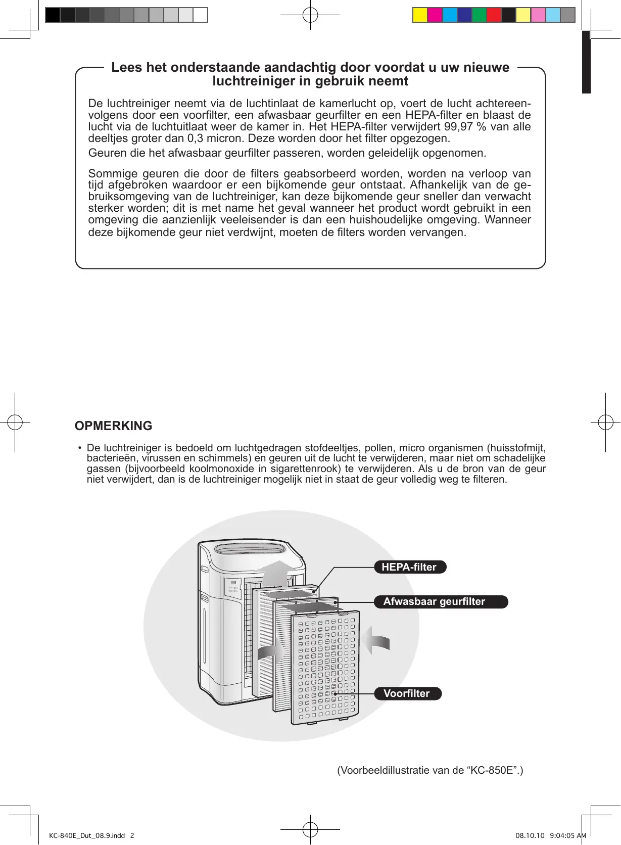 08.10.10 9:04:34 AM RICHTLIJNEN VOOR HET VERVANGEN VAN DE FILTERS De levensduur van de filters is afhankelijk van de omstandigheden, het gebruik en de locatie van de luchtreiniger. Vervang de filters wanneer stof of nare geuren niet meer worden verwijderd. (Lees ook “Lees het onderstaande aandachtig door voordat u uw nieuwe luchtreiniger in gebruik neemt”)
