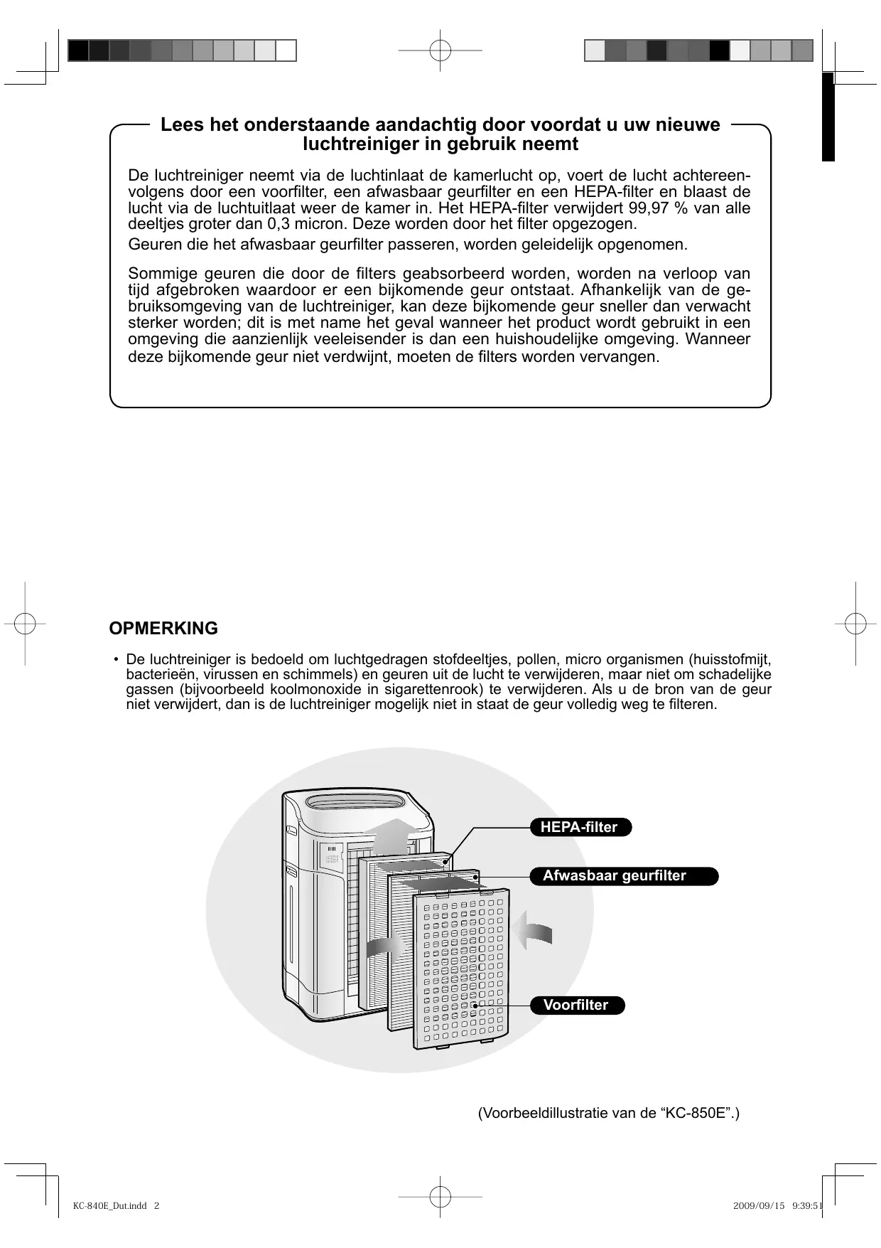 Lees het onderstaande aandachtig door voordat u uw nieuwe luchtreiniger in gebruik neemt De luchtreiniger neemt via de luchtinlaat de kamerlucht op, voert de lucht achtereenvolgens door een voorfilter, een afwasbaar geurfilter en een HEPA-filter en blaast de lucht via de luchtuitlaat weer de kamer in. Het HEPA-filter verwijdert 99,97 % van alle deeltjes groter dan 0,3 micron. Deze worden door het filter opgezogen. Geuren die het afwasbaar geurfilter passeren, worden geleidelijk opgenomen. Sommige geuren die door de filters geabsorbeerd worden, worden na verloop van tijd afgebroken waardoor er een bijkomende geur ontstaat. Afhankelijk van de gebruiksomgeving van de luchtreiniger, kan deze bijkomende geur sneller dan verwacht sterker worden; dit is met name het geval wanneer het product wordt gebruikt in een omgeving die aanzienlijk veeleisender is dan een huishoudelijke omgeving. Wanneer deze bijkomende geur niet verdwijnt, moeten de filters worden vervangen.