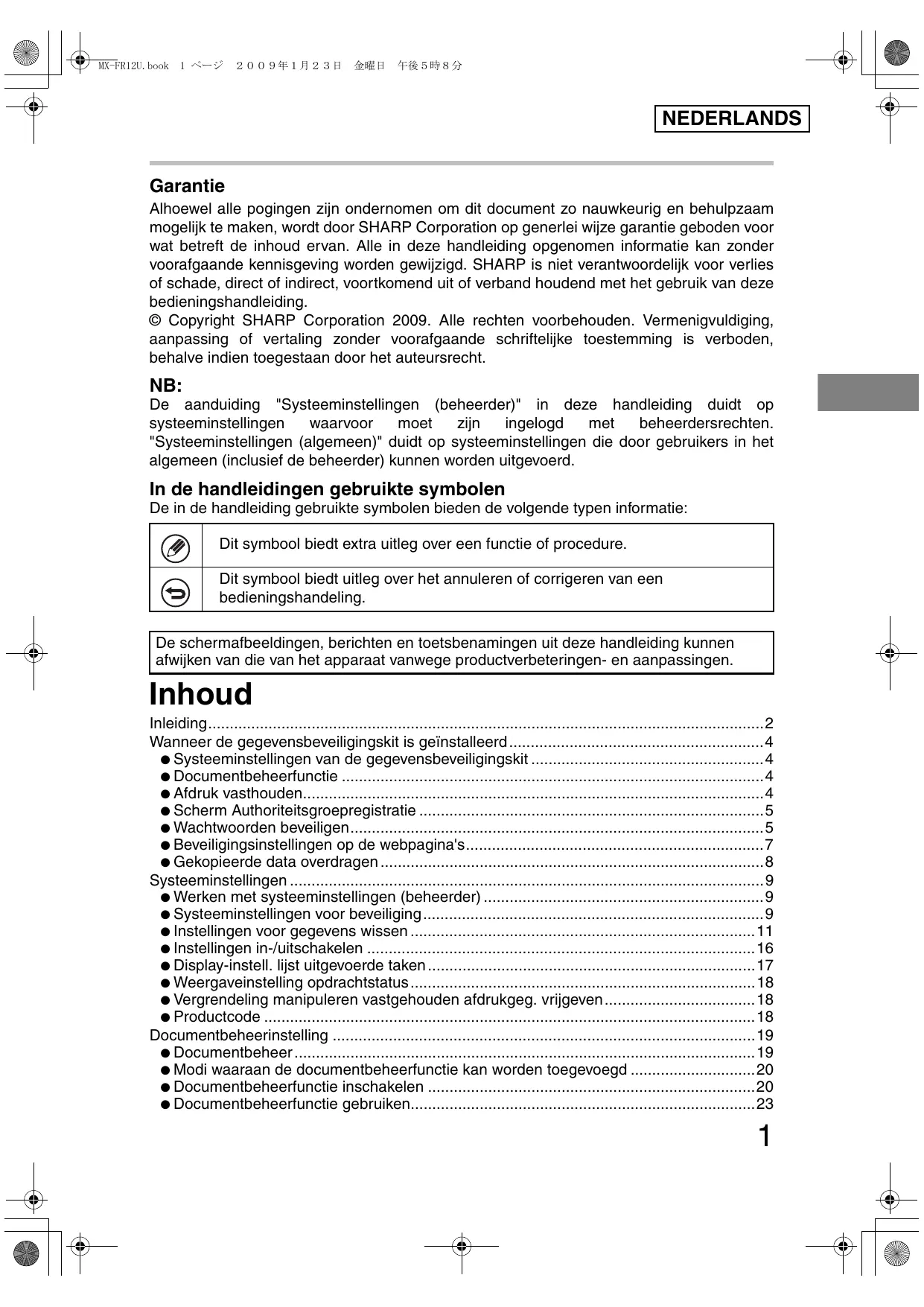 - NEDERLANDS Garantie Alhoewel alle pogingen zijn ondernomen om dit document zo nauwkeurig en behulpzaam mogelijk te maken, wordt door SHARP Corporation op generlei wijze garantie geboden voor wat betreft de inhoud ervan. Alle in deze handleiding opgenomen informatie kan zonder voorafgaande kennisgeving worden gewijzigd. SHARP is niet verantwoordelijk voor verlies of schade, direct of indirect, voortkomend uit of verband houdend met het gebruik van deze bedieningshandleiding. © Copyright SHARP Corporation 2009. Alle rechten voorbehouden. Vermenigvuldiging, aanpassing of vertaling zonder voorafgaande schriftelijke toestemming is verboden, behalve indien toegestaan door het auteursrecht. NB: De aanduiding "Systeeminstellingen (beheerder)" in deze handleiding duidt op systeeminstellingen waarvoor moet zijn ingelogd met beheerdersrechten. "Systeeminstellingen (algemeen)" duidt op systeeminstellingen die door gebruikers in het algemeen (inclusief de beheerder) kunnen worden uitgevoerd. In de handleidingen gebruikte symbolen De in de handleiding gebruikte symbolen bieden de volgende typen informatie: Dit symbool biedt extra uitleg over een functie of procedure. Dit symbool biedt uitleg over het annuleren of corrigeren van een bedieningshandeling. De schermafbeeldingen, berichten en toetsbenamingen uit deze handleiding kunnen afwijken van die van het apparaat vanwege productverbeteringen- en aanpassingen. Inhoud Inleiding p. 2