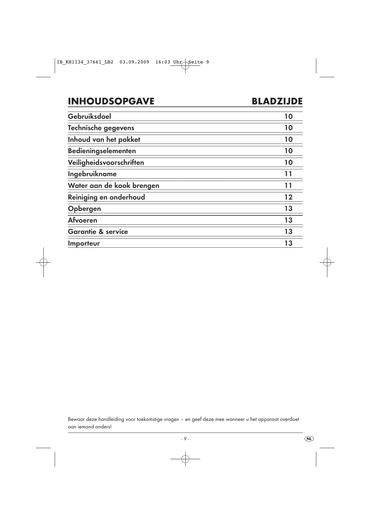 INHOUDSOPGAVE BLADZIJDE Gebruiksdoel 10 Technische gegevens 10 Inhoud van het pakket 10 Bedieningselementen 10 Veiligheidsvoorschriften 10 Ingebruikname 11 Water aan de kook brengen 11 Reiniging en onderhoud 12 Opbergen 13 Afvoeren 13 Garantie & service 13 Importeur 13 Bewaar deze handleiding voor toekomstige vragen - en geef deze mee wanneer u het apparaat overdoet aan iemand anders!