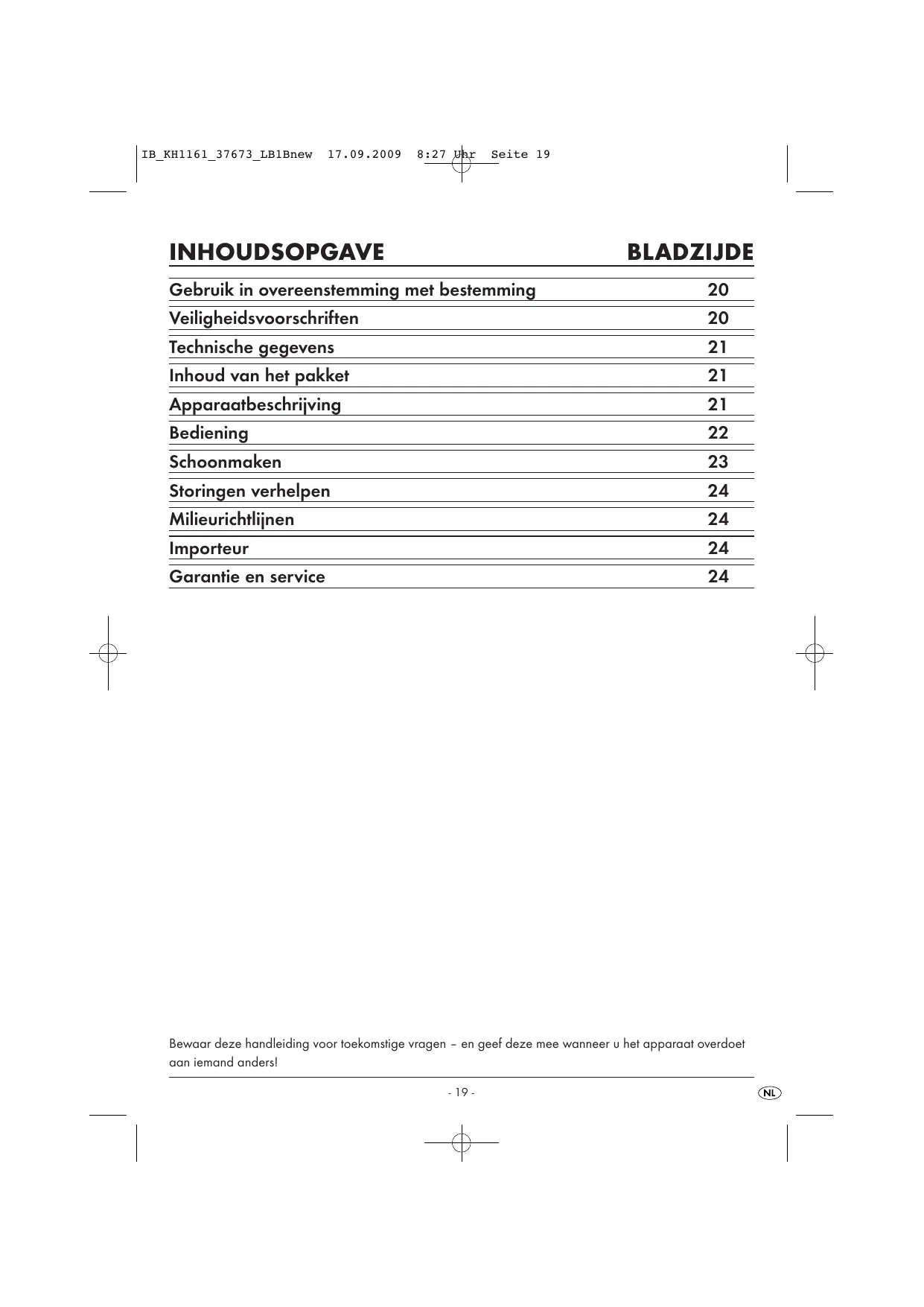 INHOUDSOPGAVE BLADZIJDE Gebruik in overeenstemming met bestemming 20 Veiligheidsvoorschriften 20 Technische gegevens 21 Inhoud van het pakket 21 Apparaatbeschrijving 21 Bediening 22 Schoonmaken 23 Storingen verhelpen 24 Milieurichtliinen 24 Importeur 24 Garantie en service 24 Bewaar deze handleiding voor toekomstige vragen - en geef deze mee wanneer u het apparaat overdoet aan iemand anders!
