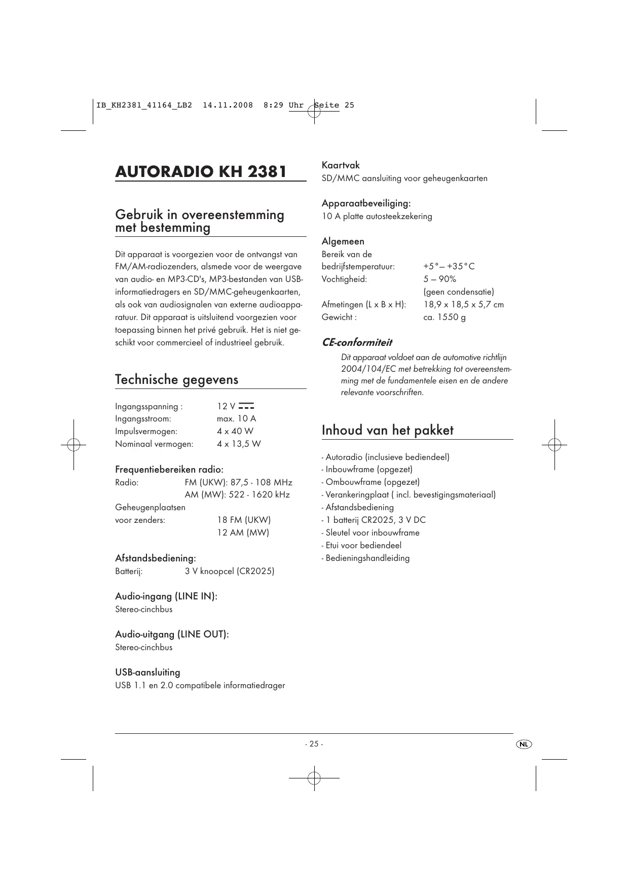 AUTORADIO KH 2381 Gebruik in overeenstemming met bestemming Dit apparaat is voorgezien voor de ontvangst van FM/AM-radiozenders, alsmede voor de weergave van audio- en MP3-CD's, MP3-bestanden van USB- informatiedragers en SD/MMC-geheugenkaarien, als ook van audiosignalen van externe audioappa- ratuur. Dit apparaat is uitsluitend voorgezien voor toepassing binnen het privé gebruik. Het is niet ge- schikt voor commercieel of industrieel gebruik. Technische gegevens Ingangsspanning 12V== Ingangsstroom: max. 10 À Impulsvermogen: 4x40W Nominaal vermogen 4x13,5W Frequentiebereiken radio: Radio: FM (UKW): 87,5 - 108 MHz AM (MW: 522 - 1620 kHz Geheugenplaatsen voor zenders: 18 FM (UKW) 12 AM (MW) Afstandsbediening: Batterij 3 V knoopcel (CR2025] Audic-ingang (LINE IN): Stereo-cinchbus Audio-uitgang (LINE OUT): Stereo-cinchbus USB-aansluiting USB 1.1 en 2.0 compatibele informatiedrager Kaartvak SD/MMC aansluiting voor geheugenkaarten Apparaatbeveiliging: 10 A platte autosteekzekering Algemeen Bereik van de bedrijfstemperatuur: +5°-+35°C Vochtigheid: 590% {geen condensatie) 18,9 x 18,5 x 5,7 cm ca. 1550 g Afmetingen [Lx B x H} Gewicht : CE-conformiteit Dit apparaat voldoet aan de automotive richtljn 2004/104/EC met betrekking tot overeenstem- ming met de fundamentele eisen en de andere relevante voorschriften: Inhoud van het pakket - Autoradio (inclusieve bediendeel) - Inbouwrame (opgezet) - Ombouwframe |opgezet) - Verankeringplaat (incl. bevestigingsmateriaal) - Afstandsbediening - 1 batterij CR2025, 3 V DC - Sleutel voor inbouwframe - Etui voor bediendeel - Bedieningshandleiding