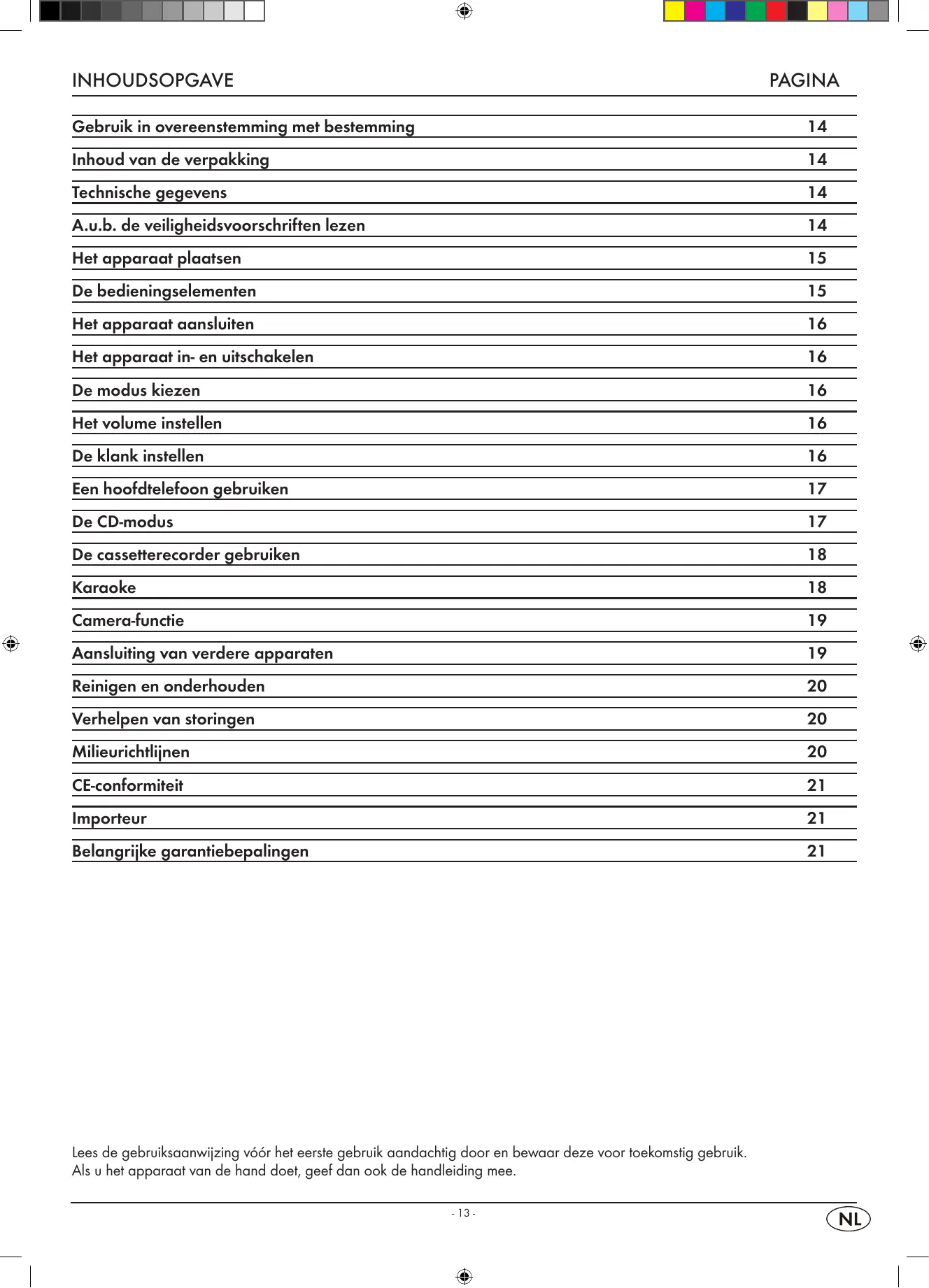 Het apparaat isuitsluitend bestemd voor de weergave van (karaoke) -CD's en -cassettes, evenals voor opnames van CD of van een externe bron voor het privé gebruik. Het apparaat is Niet bedoeld voor gebruik in bedrijsmatige of industrièle omgevingen.
