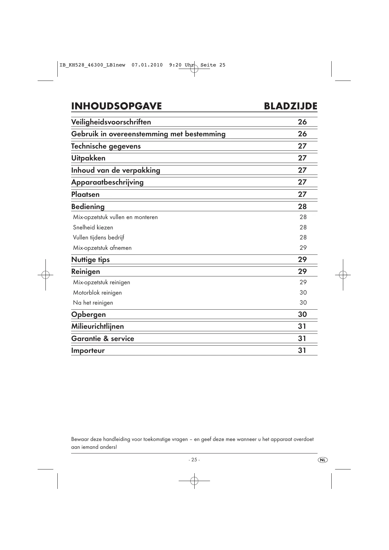 Bewaar deze handleiding voor toekomstige vragen – en geef deze mee wanneer u het apparaat overdoet aan iemand anders!