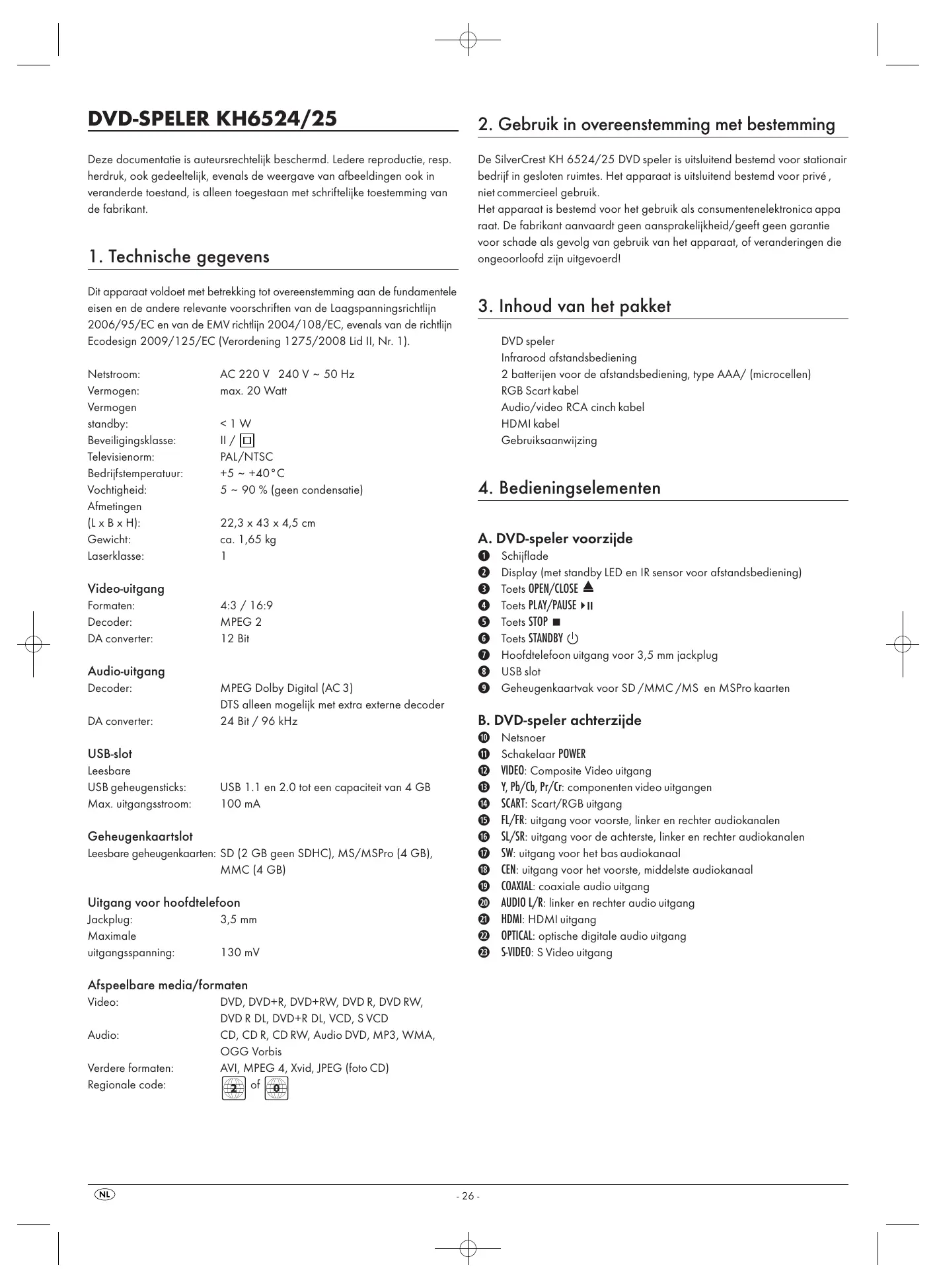 Deze documentatie is auteursrechtelijk beschermd. Ledere reproductie, resp. herdruk, ook gedeeltelijk, evenals de weergave van afbeeldingen ook in veranderde toestand, is alleen toegestaan met schriftelijke toestemming van de fabrikant. De SilverCrest KH 6524/25 DVD speler is uitsluitend bestemd voor stationair bedrijf in gesloten ruimtes. Het apparaat is uitsluitend bestemd voor privé , niet commercieel gebruik. Het apparaat is bestemd voor het gebruik als consumentenelektronica appa raat. De fabrikant aanvaardt geen aansprakelijkheid/geeft geen garantie voor schade als gevolg van gebruik van het apparaat, of veranderingen die ongeoorloofd zijn uitgevoerd!