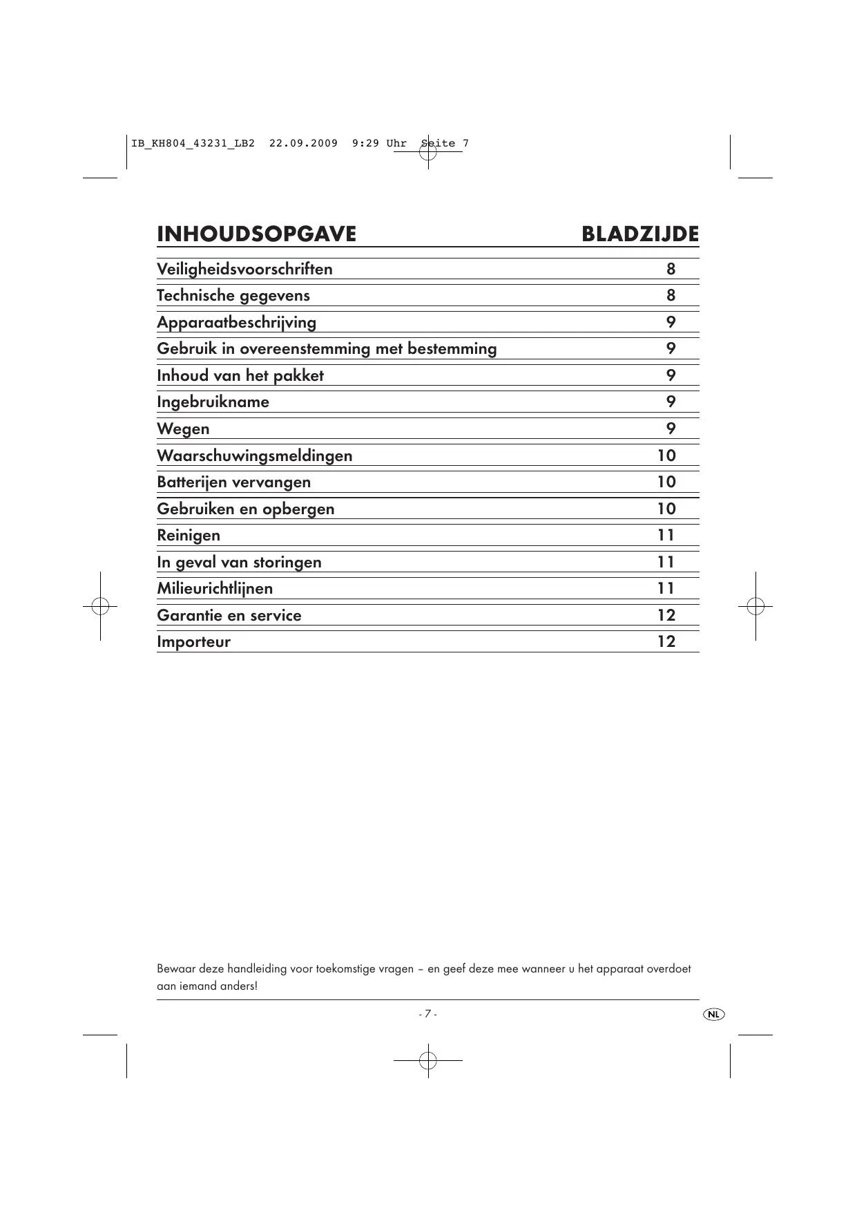 INHOUDSOPGAVE BLADZIJDE Veiligheidsvoorschriften 8 Technische gegevens 8 Apparaatbeschrijving 9 Gebruik in overeenstemming met bestemming 9 Inhoud van het pakket 9 Ingebruikname 9 Wegen 9 Waarschuwingsmeldingen 10 Batterijen vervangen 10 Gebruiken en ophergen 10 Reinigen 11 In geval van storingen 11 Milieurichtliinen 11 h an | Garantie en service 12 | Importeur 12