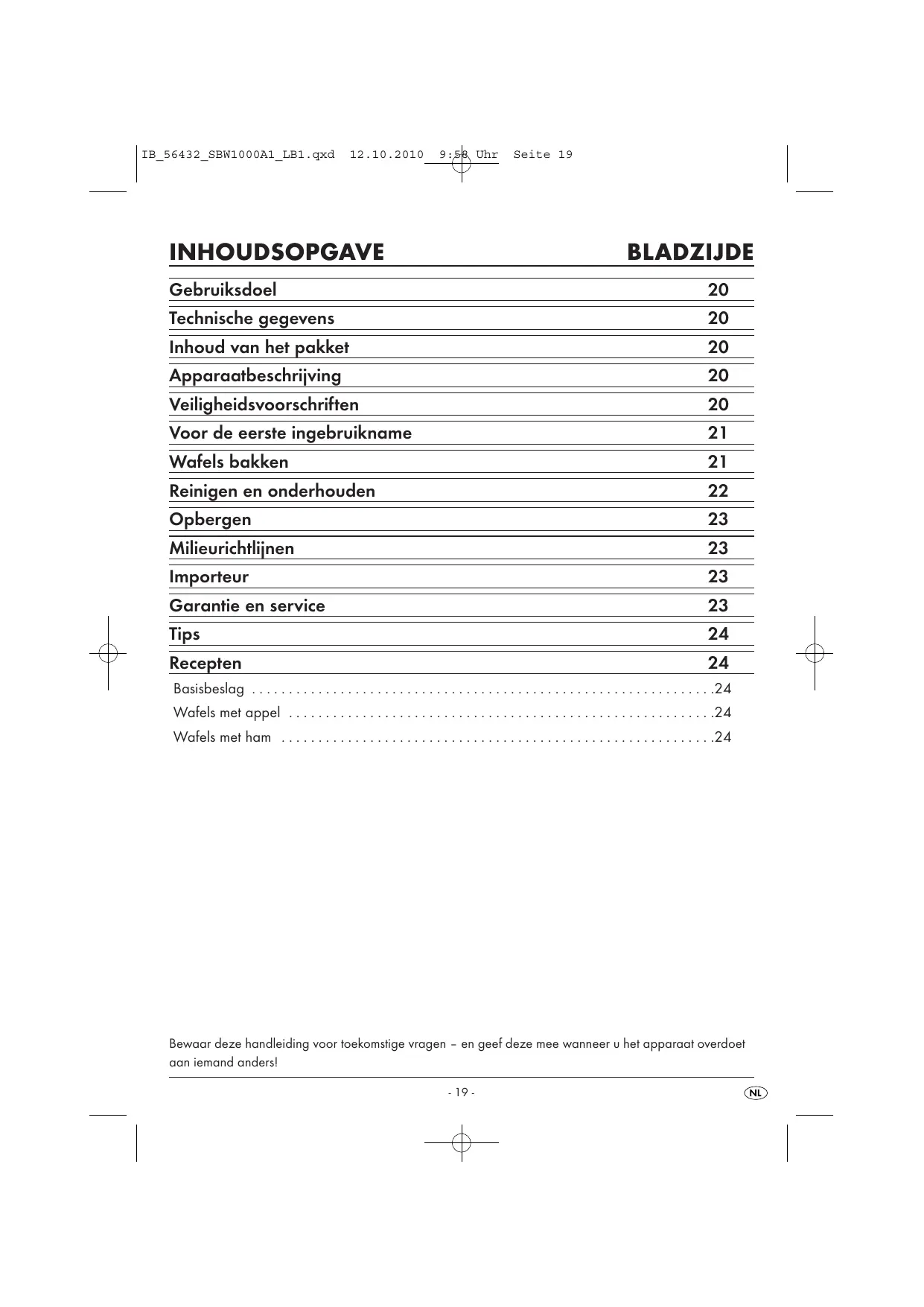 Bewaar deze handleiding voor toekomstige vragen – en geef deze mee wanneer u het apparaat overdoet aan iemand anders! - 19 -