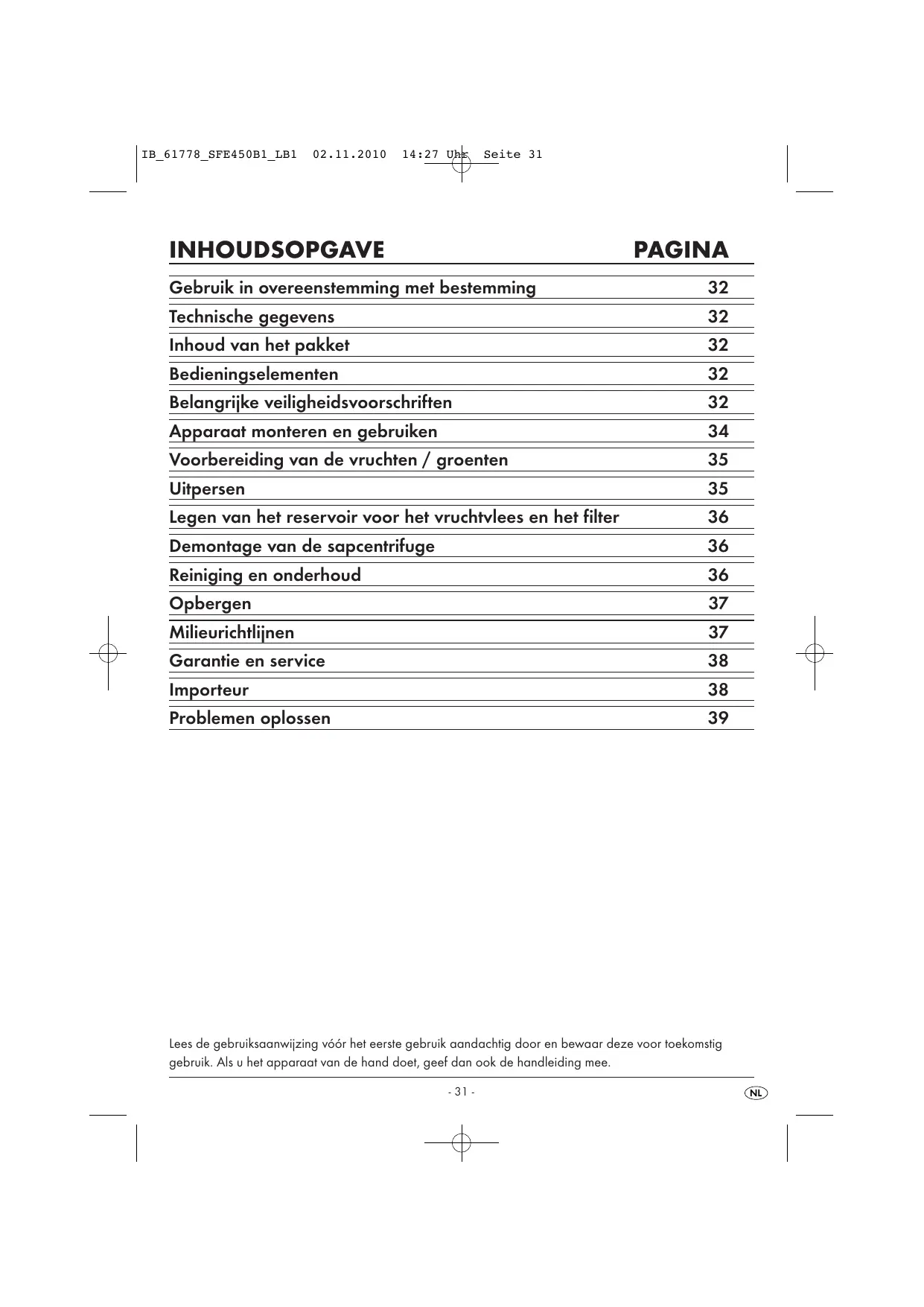 Lees de gebruiksaanwijzing vóór het eerste gebruik aandachtig door en bewaar deze voor toekomstig gebruik. Als u het apparaat van de hand doet, geef dan ook de handleiding mee. - 31 -