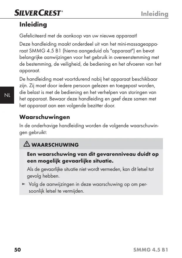 Inleiding Inleiding Gefeliciteerd met de aankoop van uw nieuwe apparaat! Deze handleiding maakt onderdeel uit van het mini-massageapparaat SMMG 4.5 B1 (hierna aangeduid als "apparaat") en bevat belangrijke aanwijzingen voor het gebruik in overeenstemming met de bestemming, de veiligheid, de bediening en het afvoeren van het apparaat.