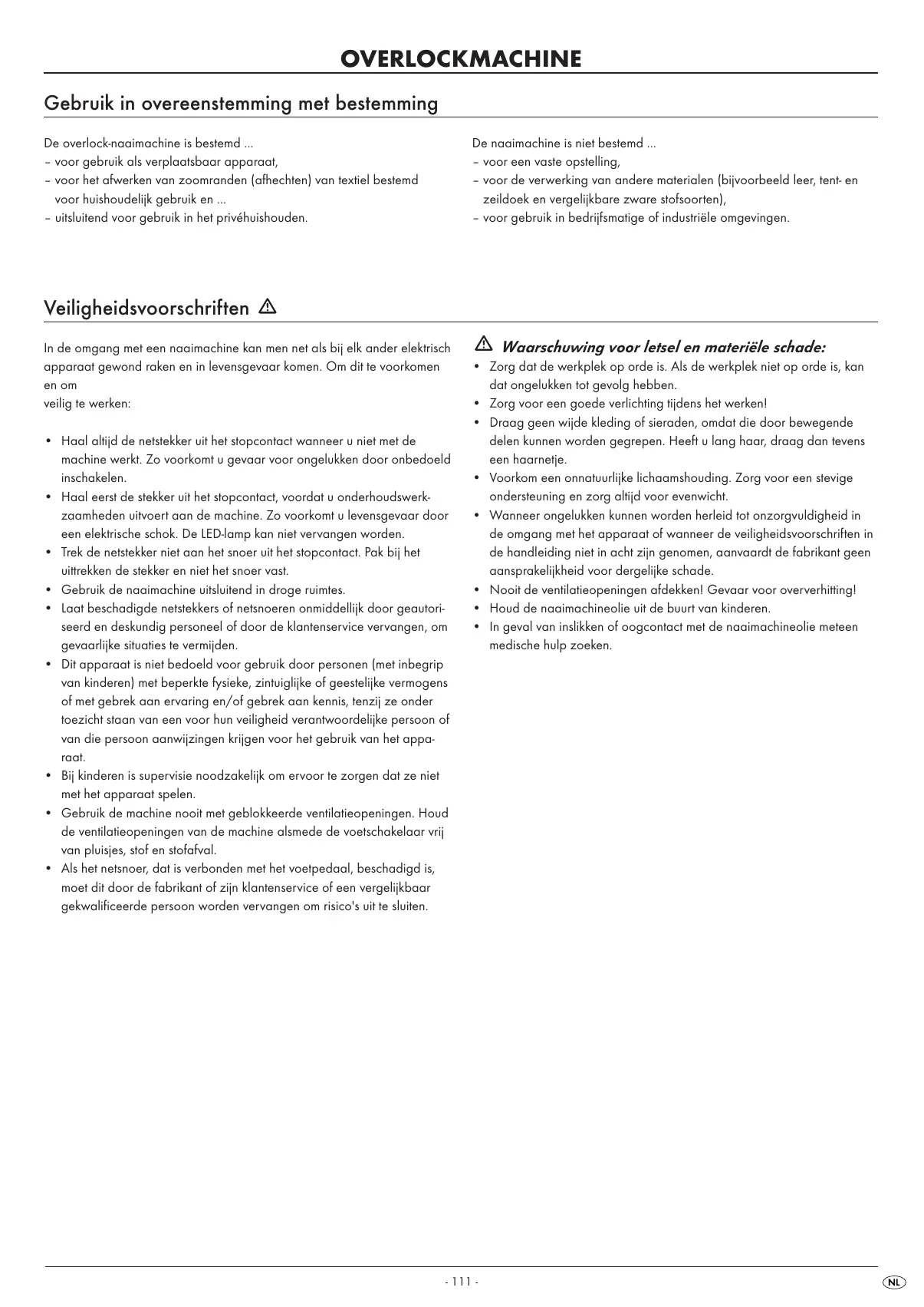 OVERLOCKMACHINE Gebruik in overeenstemming met bestemming De overlock-naaimachine is bestemd ... – voor gebruik als verplaatsbaar apparaat, – voor het afwerken van zoomranden (afhechten) van textiel bestemd voor huishoudelijk gebruik en ... – uitsluitend voor gebruik in het privéhuishouden. De naaimachine is niet bestemd ... – voor een vaste opstelling, – voor de verwerking van andere materialen (bijvoorbeeld leer, tent- en zeildoek en vergelijkbare zware stofsoorten), – voor gebruik in bedrijfsmatige of industriële omgevingen. Veiligheidsvoorschriften In de omgang met een naaimachine kan men net als bij elk ander elektrisch apparaat gewond raken en in levensgevaar komen. Om dit te voorkomen en om veilig te werken: