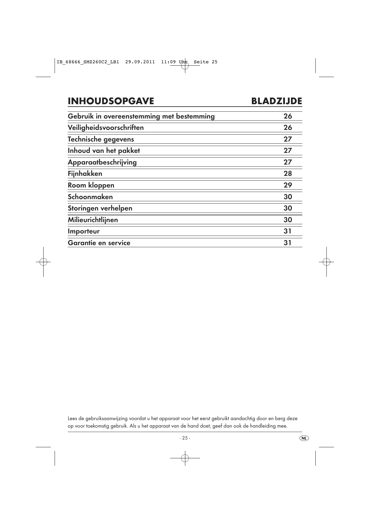 11:09 Uhr Importeur Seite 31 Service Nederland Tel.: 0900 0400223 (0,10 EUR/Min.) E-Mail: kompernass@lidl.nl KOMPERNASS GMBH BURGSTRASSE 21 44867 BOCHUM, GERMANY IAN 68666 www.kompernass.com Garantie en service U heeft op dit apparaat 3 jaar garantie vanaf de aankoopdatum. Het apparaat is met de grootst mogelijke zorg vervaardigd en voorafgaand aan de levering nauwkeurig gecontroleerd. Bewaar a.u.b. de kassabon als aankoopbewijs. Als u aanspraak wilt maken op garantie, neem dan a.u.b. telefonisch contact op met uw servicefiliaal. Alleen op die manier is een kostenloze verzending van uw product gegarandeerd. De garantie geldt alleen voor materiaal- of fabricagefouten, echter niet voor transportschade, of voor onderdelen die aan slijtage onderhevig zijn, of voor beschadigingen aan breekbare delen, bijv. schakelaars of accu's. Het product is uitsluitend bestemd voor privé-gebruik en niet voor bedrijfsmatige doeleinden. Bij verkeerd gebruik en ondeskundige behandeling, bij gebruik van geweld en bij reparaties die niet door ons geautoriseerd servicefiliaal zijn uitgevoerd, vervalt de garantie. Uw wettelijke rechten worden door deze garantie niet beperkt. De garantieperiode wordt niet verlengd door de aansprakelijkheid. Dit geldt eveneens voor vervangen en gerepareerde onderdelen. Schade en gebreken die mogelijk reeds bij de aankoop aanwezig zijn, moeten direct na het uitpakken worden gemeld, uiterlijk echter twee dagen na de dag van aankoop. Na verstrijken van de garantieperiode moeten alle voorkomende reparaties vergoed worden.