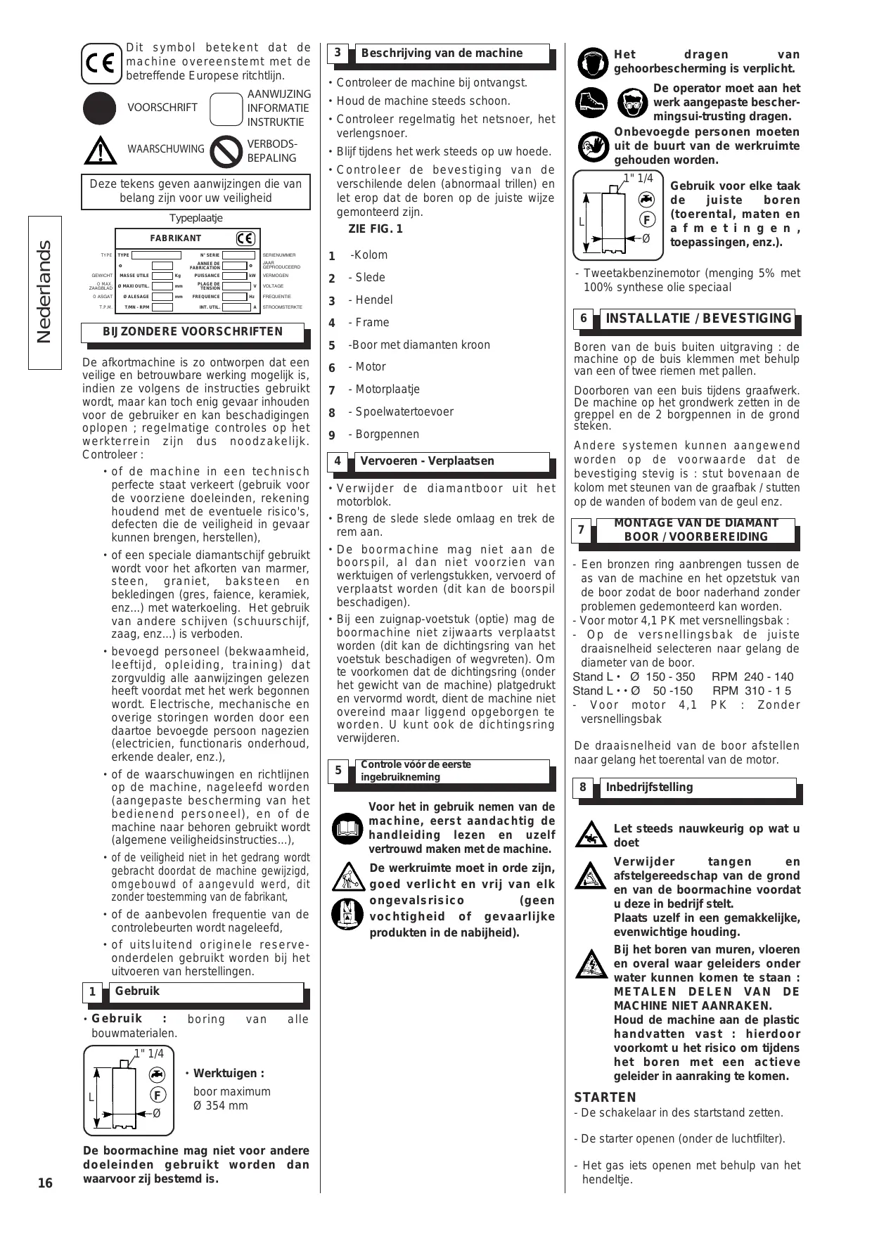 boor maximum Ø 354 mm De boormachine mag niet voor andere doeleinden gebruikt worden dan waarvoor zij bestemd is.