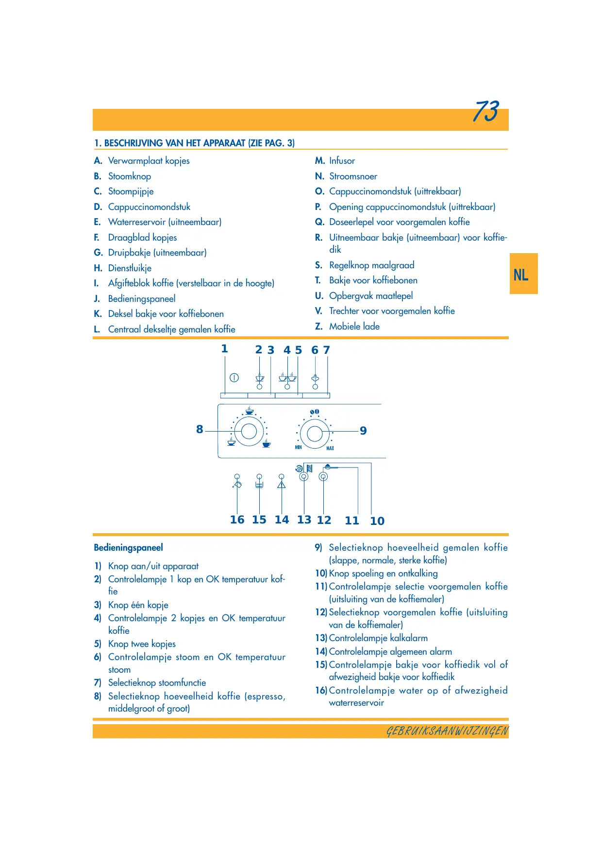 • Cette machine est fabriquée pour 'faire du café expresso' et pour 'réchauffer des boissons'. Attention aux brûlures provoquées par les jets d’eau chaude ou de vapeur ou par un usage impropre de l’appareil.