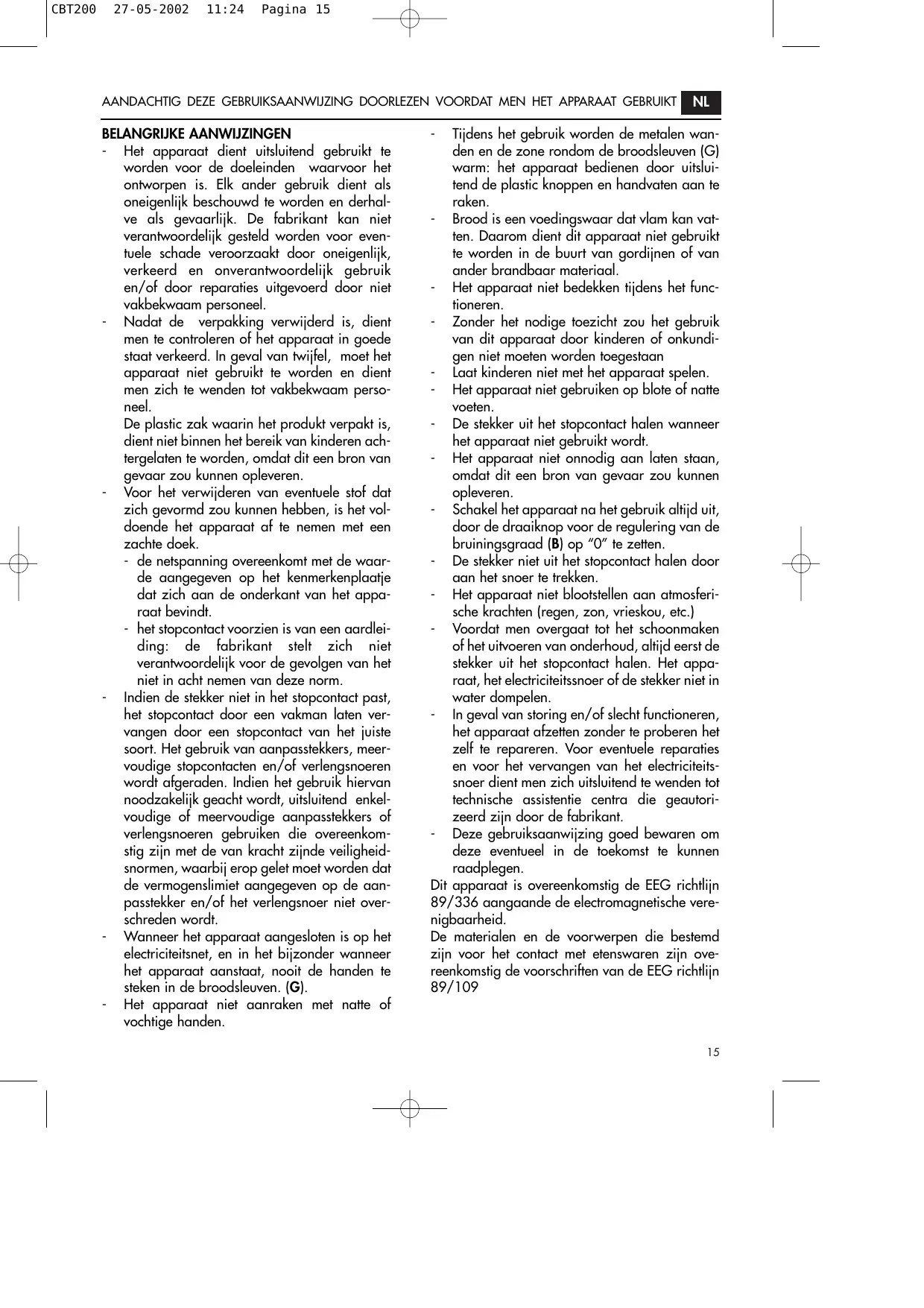 CBT200 27-05-2002 11:24 Pagina 15 AANDACHTIG DEZE GEBRUIKSAANWUZING DOORLEZEN VOORDAT MEN HET APPARAAT GEBRUIKT [Ni | BELANGRUKE AANWUZINGEN Het apparaat dient uitsluitend gebruikt te worden voor de doeleinden waarvoor het ontworpen is. Elk ander gebruik dient als oneigenlifk beschouwd te worden en derhal- ve als gevaarlik. De fabrikant kan niet verantwoordelik gesteld worden voor even- tuele schade veroorzaakt door oneigenlik, verkeerd en onverantwoordelik gebruik en/of door reparaties uitgevoerd door niet vakbekwaam personeel. Nadat de verpakking verwiiderd is, dient men te controleren of het apparaat in goede staat verkeerd. In geval van twifel, moet het apparaat niet gebruikt te worden en dient men zich te wenden tot vakbekwaam perso- neel. De plastic zak waarin het produkt verpakt is, dient niet binnen het bereik van kinderen ach- tergelaten te worden, omdat dit een bron van gevaar zou kunnen opleveren. Voor het verwijderen van eventuele stof dat zich gevormd zou kunnen hebben, is het vol- doende het apparaat af te nemen met een zachte doek. - de netspanning overeenkomt met de waar- de aangegeven op het kenmerkenplaatie dat zich aan de onderkant van het appa- raat bevindl. het stopcontact voorzien is van een aardlei- ding: de fabrikant stelt zich niet verantwoordeliik voor de gevolgen van het niet in acht nemen van deze norm. Indien de stekker niet in het stopcontact past, het stopcontact door een vakman laten ver- vangen door een stopcontact van het juiste soort. Het gebruik van aanpasstekkers, meer- voudige stopcontacten en/of verlengsnoeren word afgeraden. Indien het gebruik hiervan noodzakelik geacht wordk, uitsluitend_enkel- voudige of meervoudige aanpasstekkers of verlengsnoeren gebruiken die overeenkom- stig ziin met de van kracht zinde veiligheid- snormen, waarbij erop gelet moet worden dat de vermogenslimiet aangegeven op de aan- passtekker en/of het verlengsnoer niet over- schreden wordt. Wanneer het apparaat aangesloten is op het electriciteitsnet, en in het bijzonder wanneer het apparaat aanstaat, nooit de handen te steken in de broodsleuven. (G). Het apparaat niet aanraken met natte of vochtige handen. Tijdens het gebruik worden de metalen wan- den en de zone rondom de broodsleuven (G] warm: het apparaat bedienen door uitslui- tend de plastic knoppen en handvaten aan te raken. Brood is een voedingswaar dat vlam kan vat- ten. Daarom dient dit apparaat niet gebruikt te worden in de buurt van gordiinen of van ander brandbaar materiaal. Het apparaat niet bedekken tijdens het func- tioneren. Zonder het nodige toezicht zou het gebruik van dit apparaat door kinderen of onkundi- gen niet moeten worden toegestaan Laat kinderen niet met het apparaat spelen. Het apparaat niet gebruiken op blote of natte voeten. De stekker uit het stopcontact halen wanneer het apparaat niet gebruikt wordit. Het apparaat niet onnodig aan laten staan, omdat dit een bron van gevaar zou kunnen opleveren. Schakel het apparaat na het gebruik altijd uit, door de draaiknop voor de regulering van de bruiningsgraad (B] op “0” te zetten. De stekker niet uit het stopcontact halen door aan het snoer te trekken. Het apparaat niet blootstellen aan atmosferi- sche krachten [regen, zon, vrieskou, etc.] Voordat men overgaat tot het schoonmaken of het uitvoeren van onderhoud, altid eerst de stekker uit het stopcontact halen. Het appa- raat, het electriciteitssnoer of de stekker niet in water dompelen. In geval van storing en/of slecht functioneren, het apparaat afzetten zonder te proberen het zelf te repareren. Voor eventuele reparaties en voor het vervangen van het electriciteits- snoer dient men zich uitsluitend te wenden tot technische assistentie centra die geautori- zeerd zijn door de fabrikant. Deze gebruiksaanwijzing goed bewaren om deze eventueel in de toekomst te kunnen raadplegen. Dit apparaat is overeenkomstig de EEG richiliin 89/336 aangaande de electromagnetische vere- nigbaarheid. De materialen en de voorwerpen die bestemd zijn voor het contact met etenswaren zijn ove- reenkomstig de voorschrifien van de EEG richilin 89/109 Pan