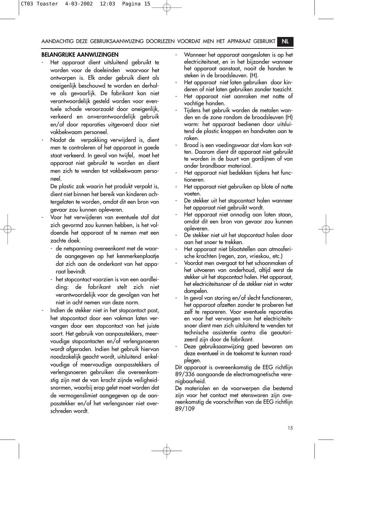 Wanneer het apparaat aangesloten is op het electriciteitsnet, en in het bijzonder wanneer het apparaat aanstaat, nooit de handen te steken in de broodsleuven. (H). - Het apparaat niet laten gebruiken door kinderen of niet laten gebruiken zonder toezicht. - Het apparaat niet aanraken met natte of vochtige handen. - Tijdens het gebruik worden de metalen wanden en de zone rondom de broodsleuven (H) warm: het apparaat bedienen door uitsluitend de plastic knoppen en handvaten aan te raken. - Brood is een voedingswaar dat vlam kan vatten. Daarom dient dit apparaat niet gebruikt te worden in de buurt van gordijnen of van ander brandbaar materiaal. - Het apparaat niet bedekken tijdens het functioneren. - Het apparaat niet gebruiken op blote of natte voeten. - De stekker uit het stopcontact halen wanneer het apparaat niet gebruikt wordt. - Het apparaat niet onnodig aan laten staan, omdat dit een bron van gevaar zou kunnen opleveren. - De stekker niet uit het stopcontact halen door aan het snoer te trekken. - Het apparaat niet blootstellen aan atmosferische krachten (regen, zon, vrieskou, etc.) - Voordat men overgaat tot het schoonmaken of het uitvoeren van onderhoud, altijd eerst de stekker uit het stopcontact halen. Het apparaat, het electriciteitssnoer of de stekker niet in water dompelen. - In geval van storing en/of slecht functioneren, het apparaat afzetten zonder te proberen het zelf te repareren. Voor eventuele reparaties en voor het vervangen van het electriciteitssnoer dient men zich uitsluitend te wenden tot technische assistentie centra die geautorizeerd zijn door de fabrikant. - Deze gebruiksaanwijzing goed bewaren om deze eventueel in de toekomst te kunnen raadplegen. Dit apparaat is overeenkomstig de EEG richtlijn 89/336 aangaande de electromagnetische verenigbaarheid. De materialen en de voorwerpen die bestemd zijn voor het contact met etenswaren zijn overeenkomstig de voorschriften van de EEG richtlijn 89/109