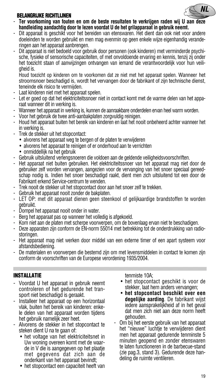 - onmiddellijk na het gebruik - Gebruik uitsluitend verlengsnoeren die voldoen aan de geldende veiligheidsvoorschriften. - Het apparaat niet buiten gebruiken. Het elektriciteitssnoer van het apparaat mag niet door de gebruiker zelf worden vervangen, aangezien voor de vervanging van het snoer speciaal gereedschap nodig is. Indien het snoer beschadigd raakt, dient men zich uitsluitend tot een door de Fabrikant erkend Service-centrum te wenden. - Trek nooit de stekker uit het stopcontact door aan het snoer zelf te trekken. - Gebruik het apparaat nooit zonder de bakplaten. - LET OP: met dit apparaat dienen geen steenkool of gelijkaardige brandstoffen te worden gebruikt. - Dompel het apparaat nooit onder in water. - Berg het apparaat pas op wanneer het volledig is afgekoeld. - Kom niet aan de platen met scherpe voorwerpen, om de bovenlaag ervan niet te beschadigen. - Deze apparaten zijn conform de EN-norm 55014 met betrekking tot de onderdrukking van radiostoringen. - Het apparaat mag niet werken door middel van een externe timer of een apart systeem voor afstandsbediening. - De materialen en voorwerpen die bestemd zijn om met levensmiddelen in contact te komen zijn conform de voorschriften van de Europese verordening 1935/2004. INSTALLATIE - Voordat U het apparaat in gebruik neemt controleren of het gedurende het transport niet beschadigd is geraakt. - Installeer het apparaat op een horizontaal vlak, buiten het bereik van kinderen: enkele delen van het apparaat worden tijdens het gebruik namelijk zeer heet. - Alvorens de stekker in het stopcontact te steken dient U na te gaan of: