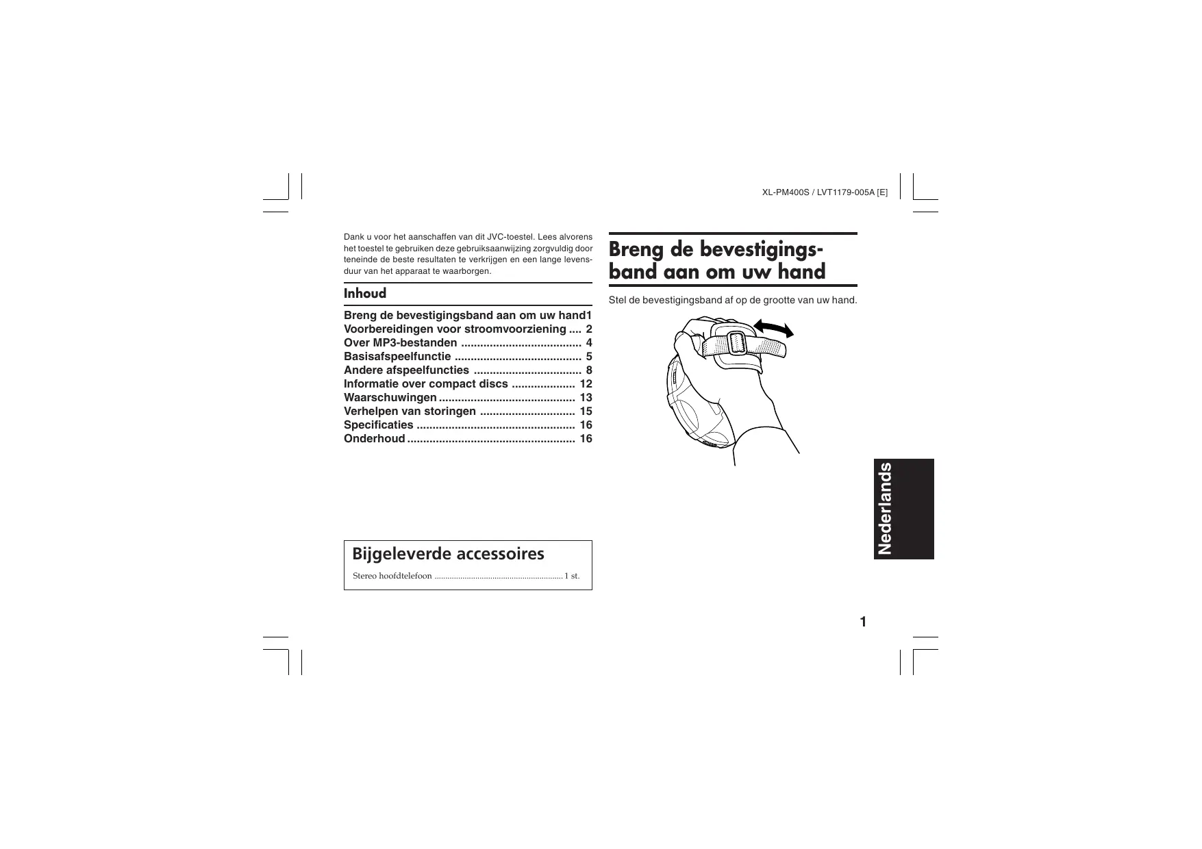 Dank u voor het aanschaffen van dit JVC-toestel. Lees alvorens hettoestel te gebruiken deze gebruiksaanwijzing zorgvuldig door teneinde de beste resultaten te verkrilgen en een lange levens- duur van het apparaat te waarborgen: Inhoud Breng de bevestigingsband aan om uw hand1 Voorbereidingen voor stroomvoorziening Over MP3-bestanden Basisafspeelfunctie Andere afspeelfuncties Informatie over compact discs Waarschuwingen . Verhelpen van storingen Specificaties Onderhoud Bijgeleverde accessoires Stereo hoofdtelefoon 1st Breng de bevestigings- band aan om uw hand Stel de bevestigingsband af op de grootte van uw hand. Nederlands