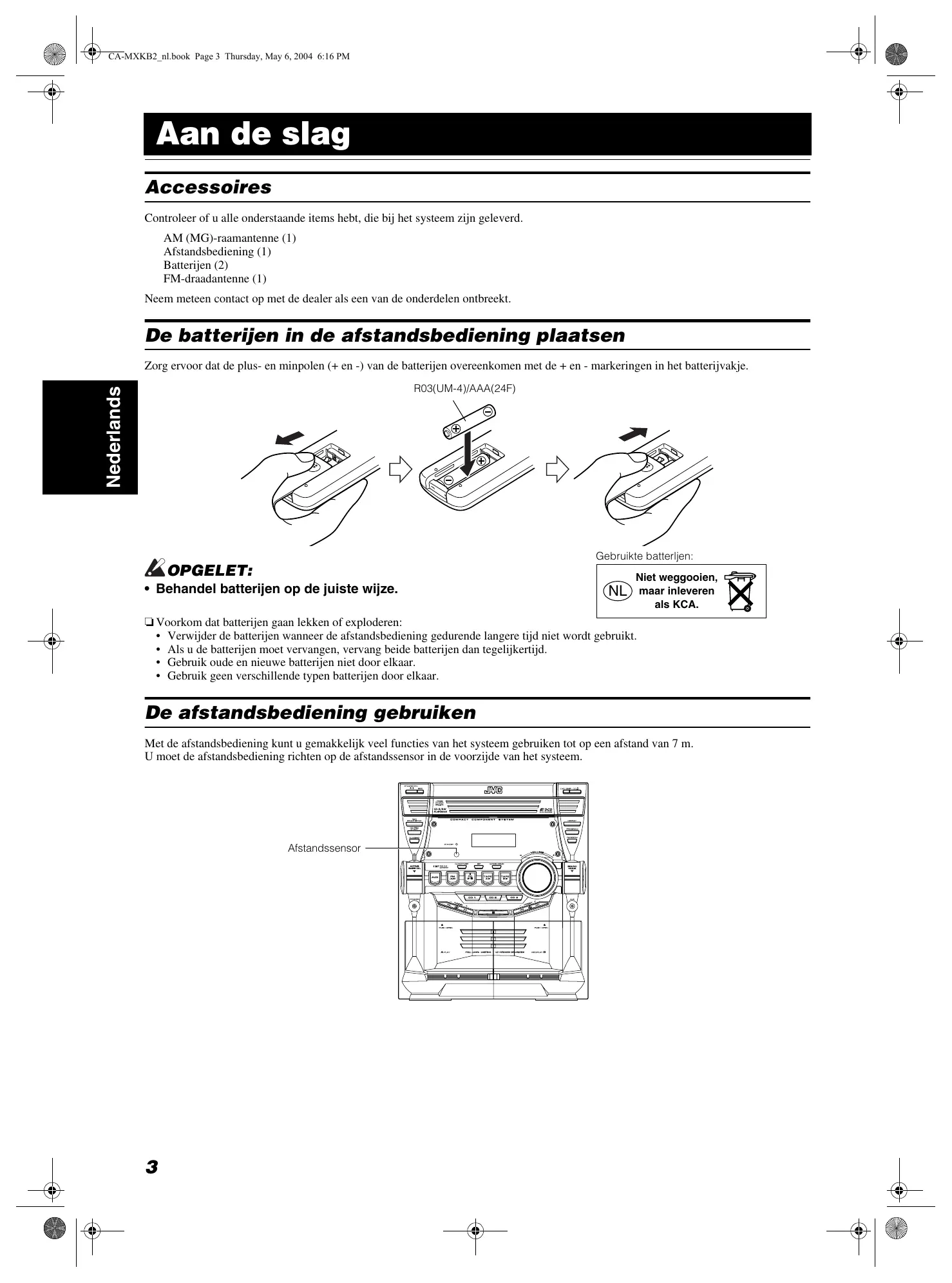 CA-MXKB2_nl.book Page 3 Thursday, May 6, 2004 6:16 PM Aan de slag Accessoires Controleer of u alle onderstaande items hebt, die bij het systeem zijn geleverd. AM (MG)-raamantenne (1) Afstandsbediening (1) Batterijen (2) FM-draadantenne (1) Neem meteen contact op met de dealer als een van de onderdelen ontbreekt. De batterijen in de afstandsbediening plaatsen Zorg ervoor dat de plus- en minpolen (+ en -) van de batterijen overeenkomen met de + en - markeringen in het batterijvakje. Nederlands R03(UM-4)/AAA(24F) Gebruikte batterljen: OPGELET: