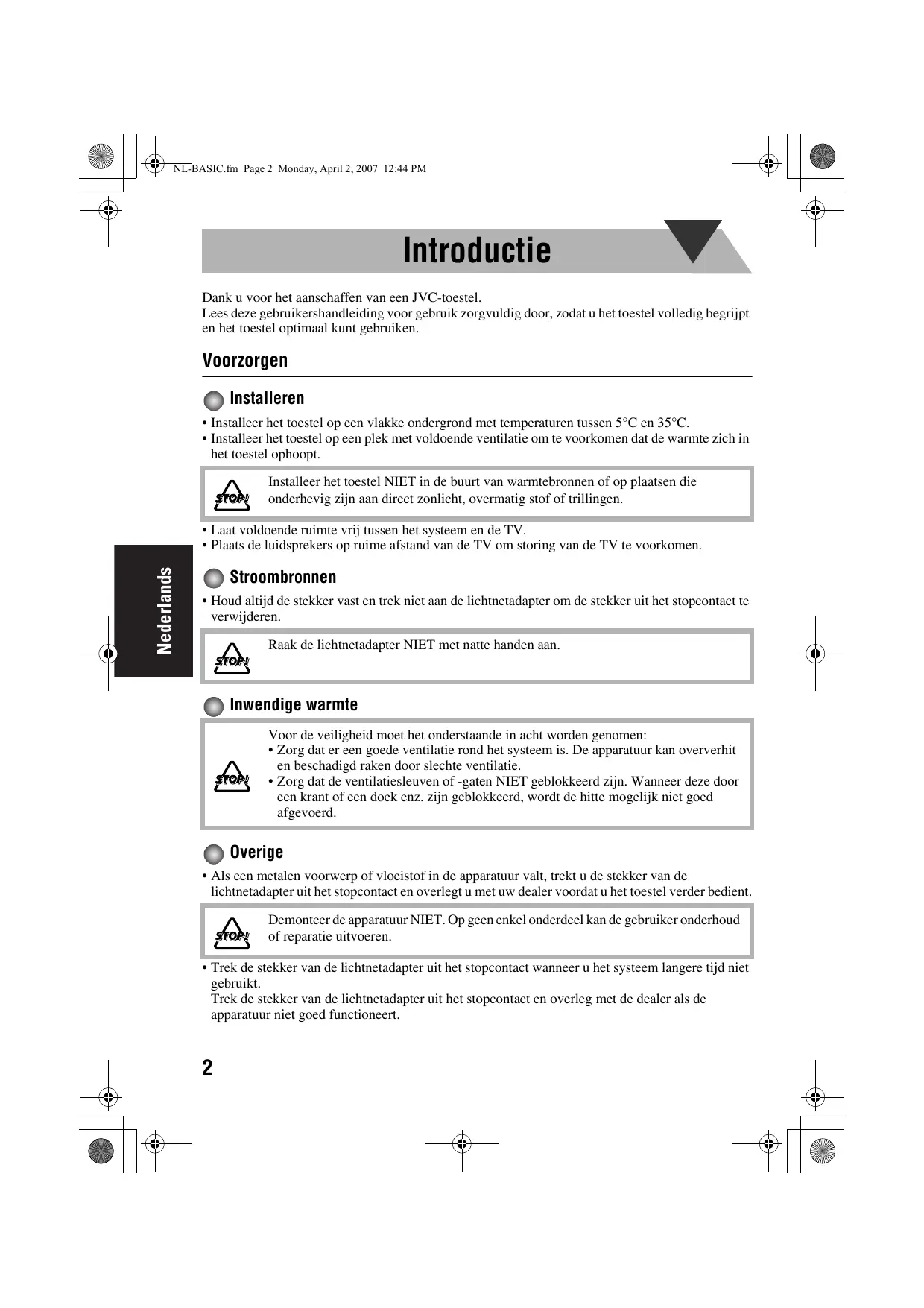 NL-BASIC.fm Page 2 Monday, April 2, 2007 12:44 PM Introductie Dank u voor het aanschaffen van een JVC-toestel. Lees deze gebruikershandleiding voor gebruik zorgvuldig door, zodat u het toestel volledig begrijpt en het toestel optimaal kunt gebruiken. Voorzorgen Installeren