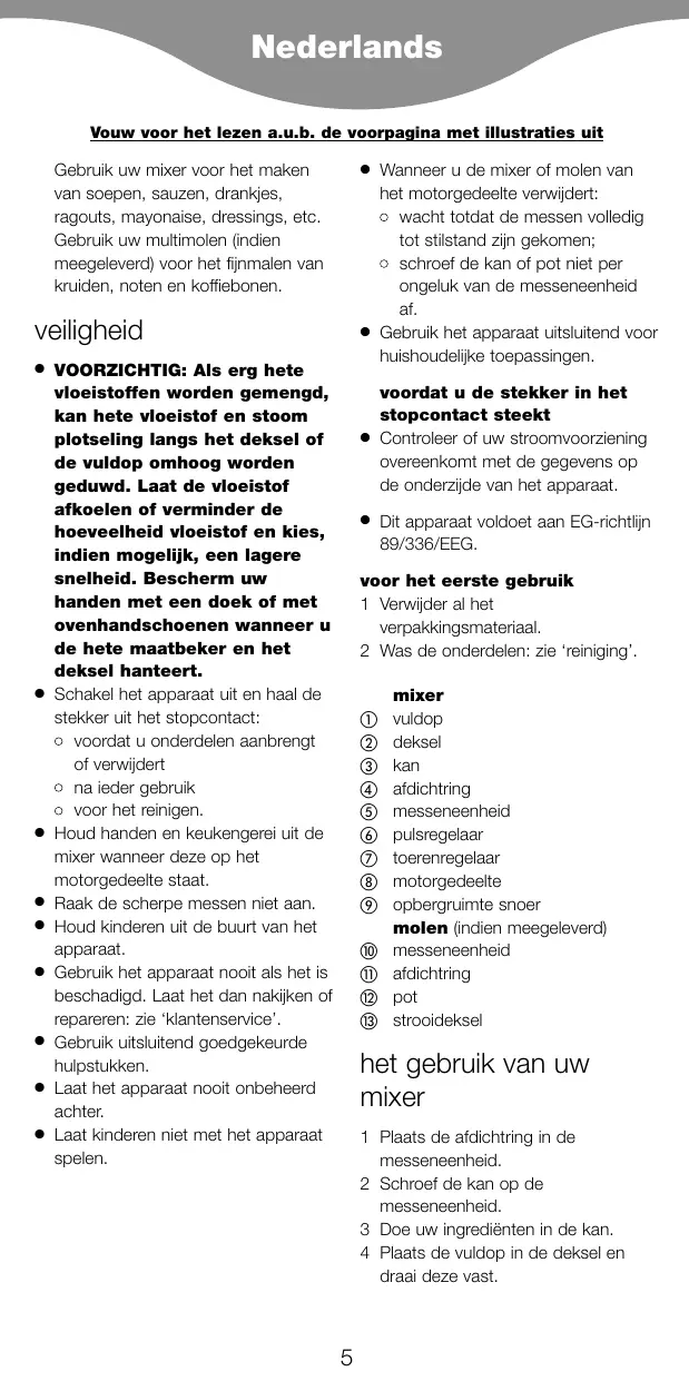 Doe geen ingrediënten in de mixer voordat u hem inschakelt. Snijd de ingrediënten indien nodig in stukjes; verwijder de vuldop; laat vervolgens de stukjes terwijl het apparaat draait, ● avant d’adapter ou de retirer des éléments ● après utilisation ● avant le nettoyage. Conservez les mains et tout ustensile hors du mélangeur lorsqu’il est en place sur le bloc-moteur. Ne touchez pas les lames tranchantes. Conservez l’appareil hors de portée des enfants. N’utilisez jamais un appareil endommagé ou en mauvais état. Faites-le vérifier et réparer. Pour cela, reportez-vous à la rubrique “service après-vente”. N’utilisez jamais un accessoire non adapté à cet appareil.