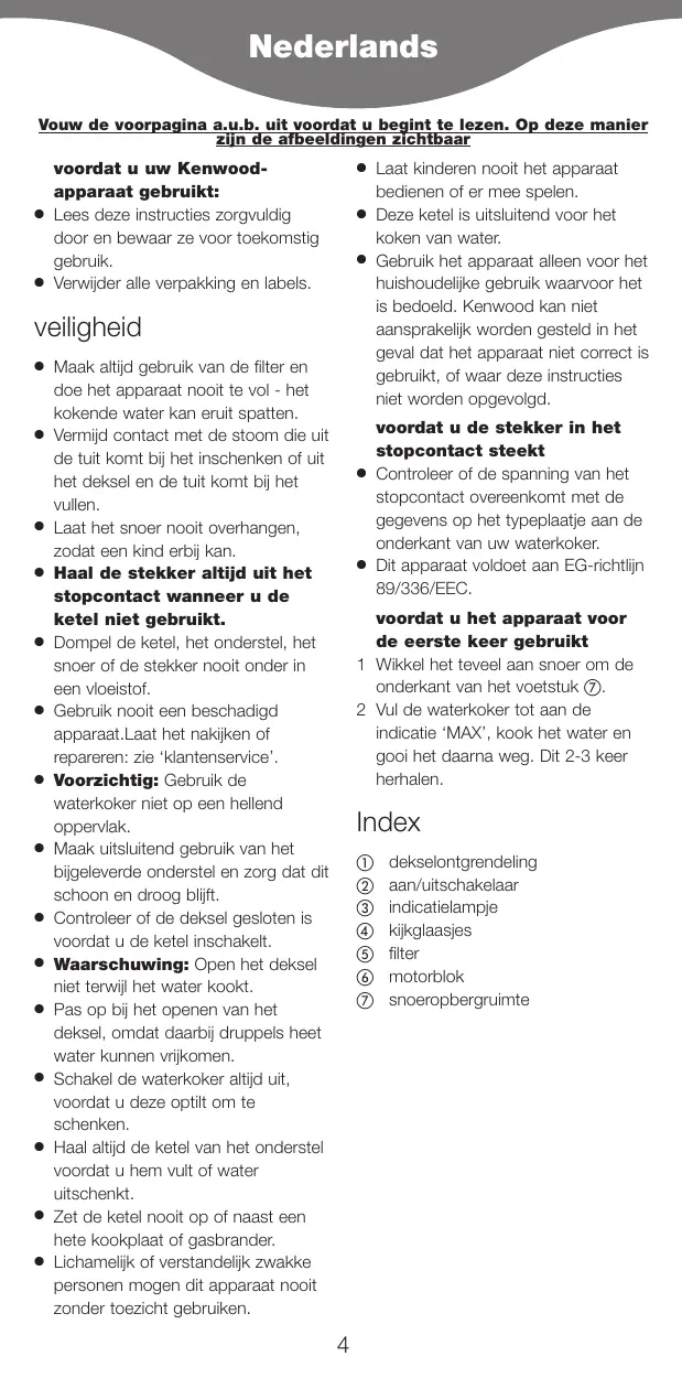 If the cord is damaged it must, for safety reasons, be replaced by KENWOOD or an authorised KENWOOD repairer. If you need help with: using your kettle servicing or repairs Contact the shop where you bought your kettle. Nederlands Vouw de voorpagina a.u.b. uit voordat u begint te lezen. Op deze manier zijn de afbeeldingen zichtbaar