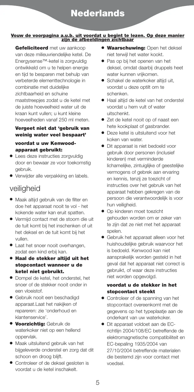 Maak altijd gebruik van de filter en doe het apparaat nooit te vol - het kokende water kan eruit spatten. Vermijd contact met de stoom die uit de tuit komt bij het inschenken of uit het deksel en de tuit komt bij het vullen. Laat het snoer nooit overhangen, zodat een kind erbij kan. Haal de stekker altijd uit het stopcontact wanneer u de ketel niet gebruikt. Dompel de ketel, het onderstel, het snoer of de stekker nooit onder in een vloeistof. Gebruik nooit een beschadigd apparaat.Laat het nakijken of repareren: zie ‘onderhoud en klantenservice’. Voorzichtig: Gebruik de waterkoker niet op een hellend oppervlak. Maak uitsluitend gebruik van het bijgeleverde onderstel en zorg dat dit schoon en droog blijft. Controleer of de deksel gesloten is voordat u de ketel inschakelt.