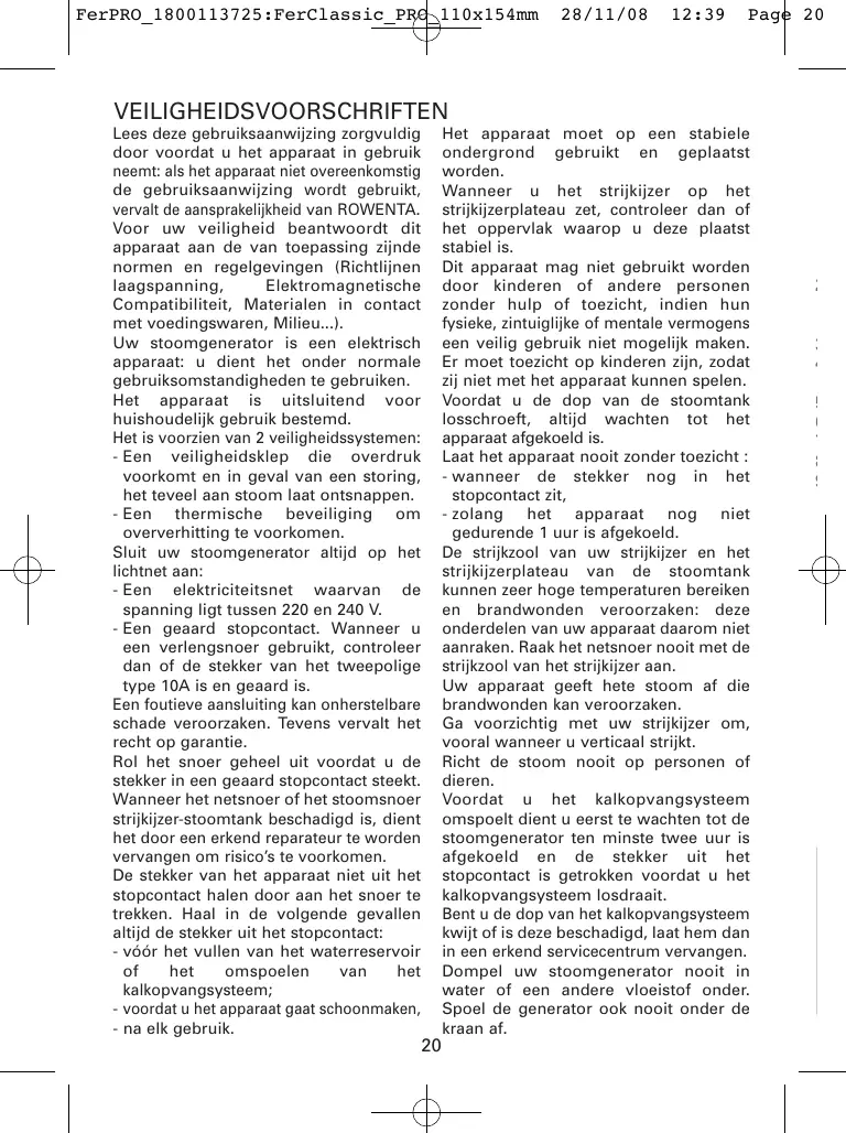FerPRO_1800113725:FerClassic_PRO_110x154mm 28/11/08 12:39 Page 20 VEILIGHEIDSVOORSCHRIFTEN Het apparaat moet op een stabiele ondergrond gebruikt en geplaatst worden. Wanneer u het strijkijzer op het strijkijzerplateau zet, controleer dan of het oppervlak waarop u deze plaatst stabiel is. Dit apparaat mag niet gebruikt worden door kinderen of andere personen zonder hulp of toezicht, indien hun fysieke, zintuiglijke of mentale vermogens een veilig gebruik niet mogelijk maken. Er moet toezicht op kinderen zijn, zodat zij niet met het apparaat kunnen spelen. Voordat u de dop van de stoomtank losschroeft, altijd wachten tot het apparaat afgekoeld is. Laat het apparaat nooit zonder toezicht : - wanneer de stekker nog in het stopcontact zit, - zolang het apparaat nog niet gedurende 1 uur is afgekoeld. De strijkzool van uw strijkijzer en het strijkijzerplateau van de stoomtank kunnen zeer hoge temperaturen bereiken en brandwonden veroorzaken: deze onderdelen van uw apparaat daarom niet aanraken. Raak het netsnoer nooit met de strijkzool van het strijkijzer aan. Uw apparaat geeft hete stoom af die brandwonden kan veroorzaken. Ga voorzichtig met uw strijkijzer om, vooral wanneer u verticaal strijkt. Richt de stoom nooit op personen of dieren. Voordat u het kalkopvangsysteem omspoelt dient u eerst te wachten tot de stoomgenerator ten minste twee uur is afgekoeld en de stekker uit het stopcontact is getrokken voordat u het kalkopvangsysteem losdraait. Bent u de dop van het kalkopvangsysteem kwijt of is deze beschadigd, laat hem dan in een erkend servicecentrum vervangen. Dompel uw stoomgenerator nooit in water of een andere vloeistof onder. Spoel de generator ook nooit onder de kraan af. Lees deze gebruiksaanwijzing zorgvuldig door voordat u het apparaat in gebruik neemt: als het apparaat niet overeenkomstig de gebruiksaanwijzing wordt gebruikt, vervalt de aansprakelijkheid van ROWENTA. Voor uw veiligheid beantwoordt dit apparaat aan de van toepassing zijnde normen en regelgevingen (Richtlijnen laagspanning, Elektromagnetische Compatibiliteit, Materialen in contact met voedingswaren, Milieu...). Uw stoomgenerator is een elektrisch apparaat: u dient het onder normale gebruiksomstandigheden te gebruiken. Het apparaat is uitsluitend voor huishoudelijk gebruik bestemd. Het is voorzien van 2 veiligheidssystemen: - Een veiligheidsklep die overdruk voorkomt en in geval van een storing, het teveel aan stoom laat ontsnappen. - Een thermische beveiliging om oververhitting te voorkomen. Sluit uw stoomgenerator altijd op het lichtnet aan: - Een elektriciteitsnet waarvan de spanning ligt tussen 220 en 240 V. - Een geaard stopcontact. Wanneer u een verlengsnoer gebruikt, controleer dan of de stekker van het tweepolige type 10A is en geaard is. Een foutieve aansluiting kan onherstelbare schade veroorzaken. Tevens vervalt het recht op garantie. Rol het snoer geheel uit voordat u de stekker in een geaard stopcontact steekt. Wanneer het netsnoer of het stoomsnoer strijkijzer-stoomtank beschadigd is, dient het door een erkend reparateur te worden vervangen om risico’s te voorkomen. De stekker van het apparaat niet uit het stopcontact halen door aan het snoer te trekken. Haal in de volgende gevallen altijd de stekker uit het stopcontact: - vóór het vullen van het waterreservoir het omspoelen van het kalkopvangsysteem; - voordat u het apparaat gaat schoonmaken, - na elk gebruik.